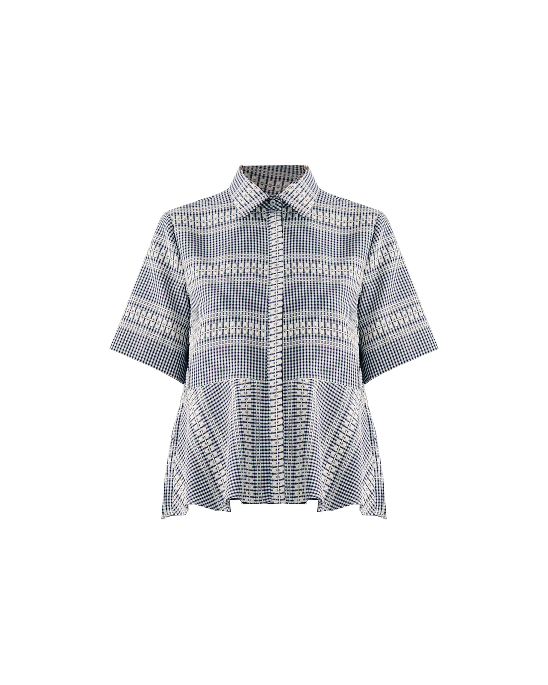 Pure cotton shirt featuring a geometric micro-check pattern. The design includes a classic collar and short sleeves, with flared side panels that create a fluid, dynamic silhouette. A fresh and contemporary piece, ideal for refined summer looks.