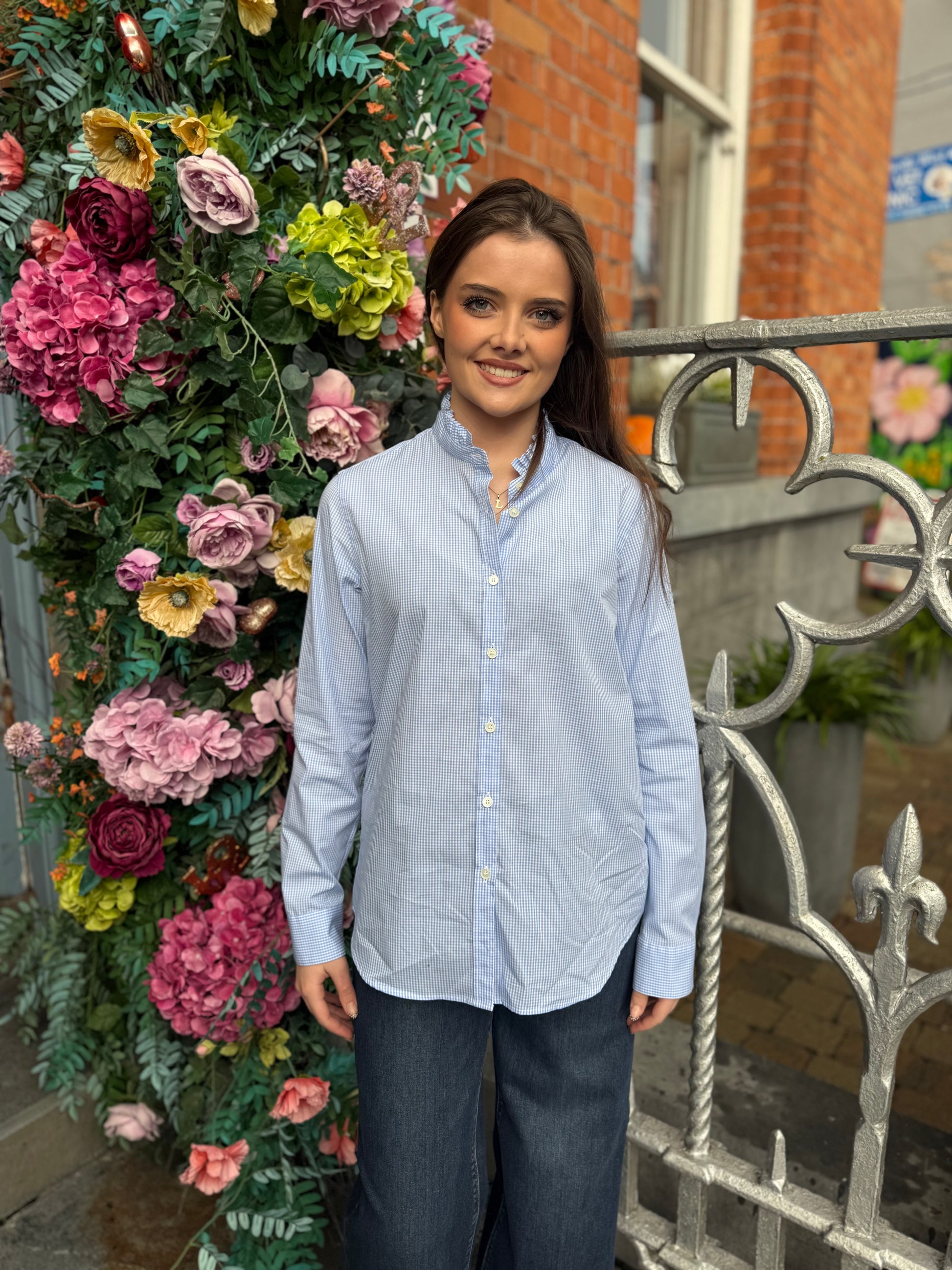 Cotton Gingham Blue And White shirt with a frill collar. This is a super shirt and has a very sophisticated but casual feel to it.