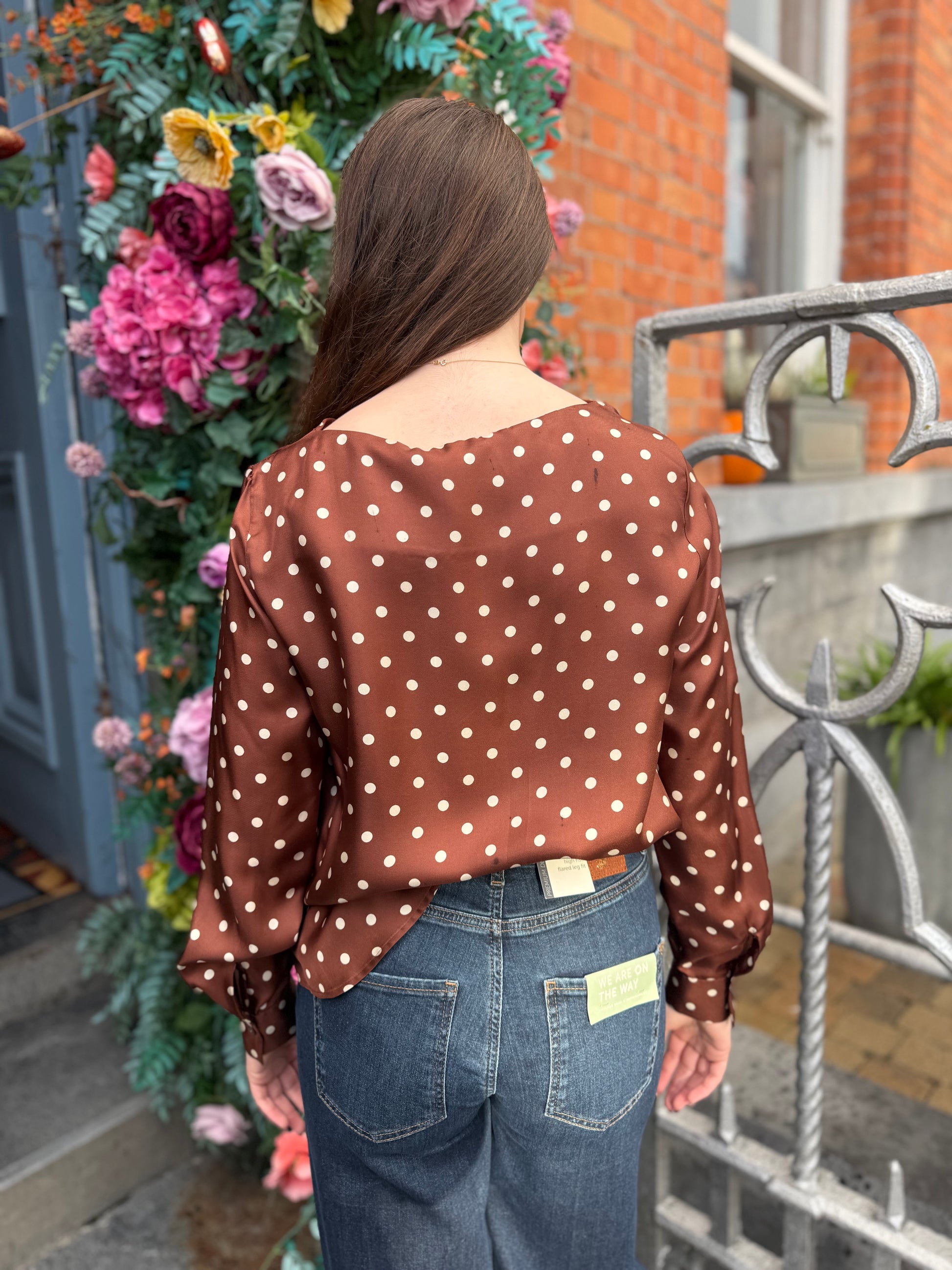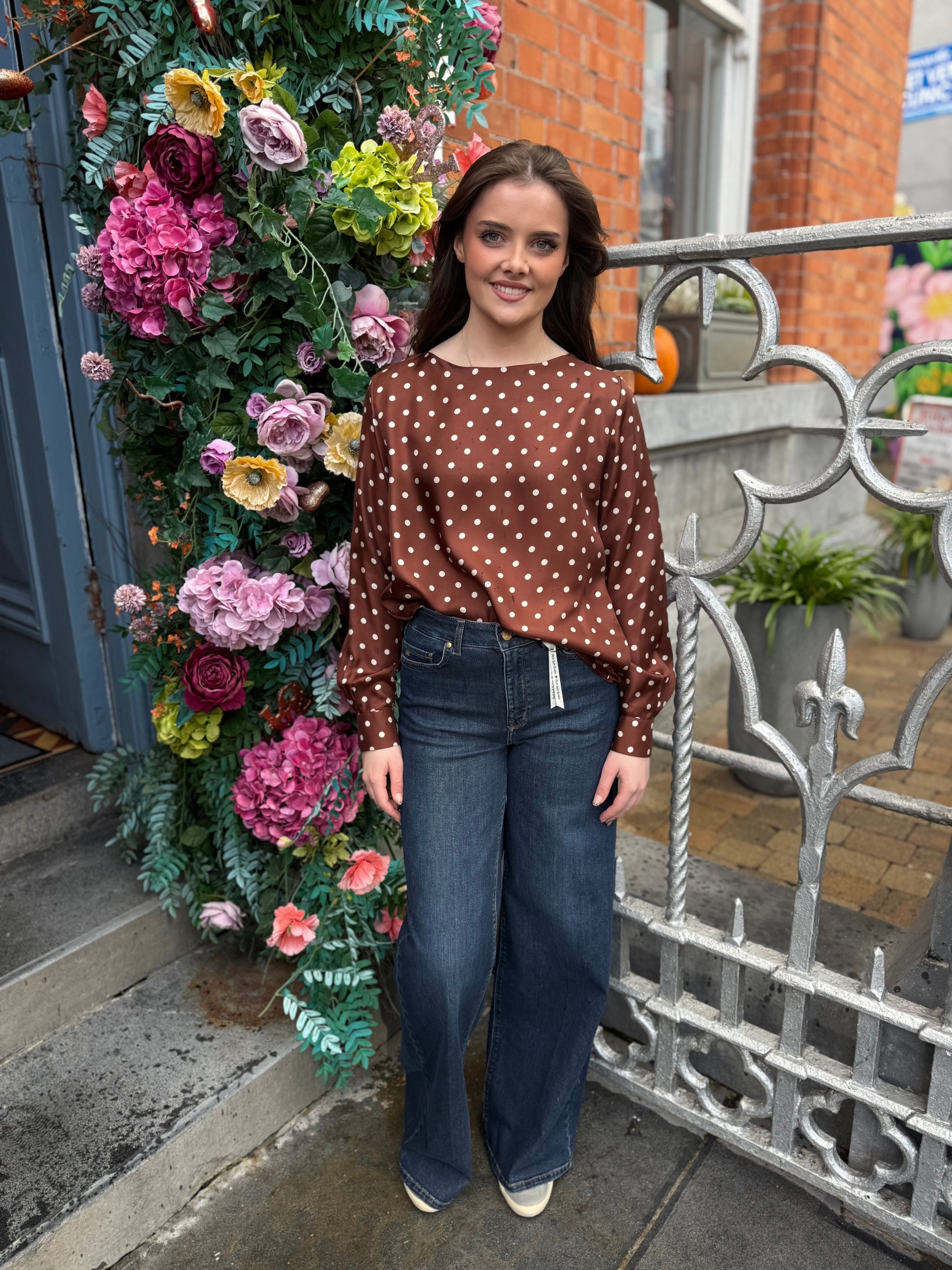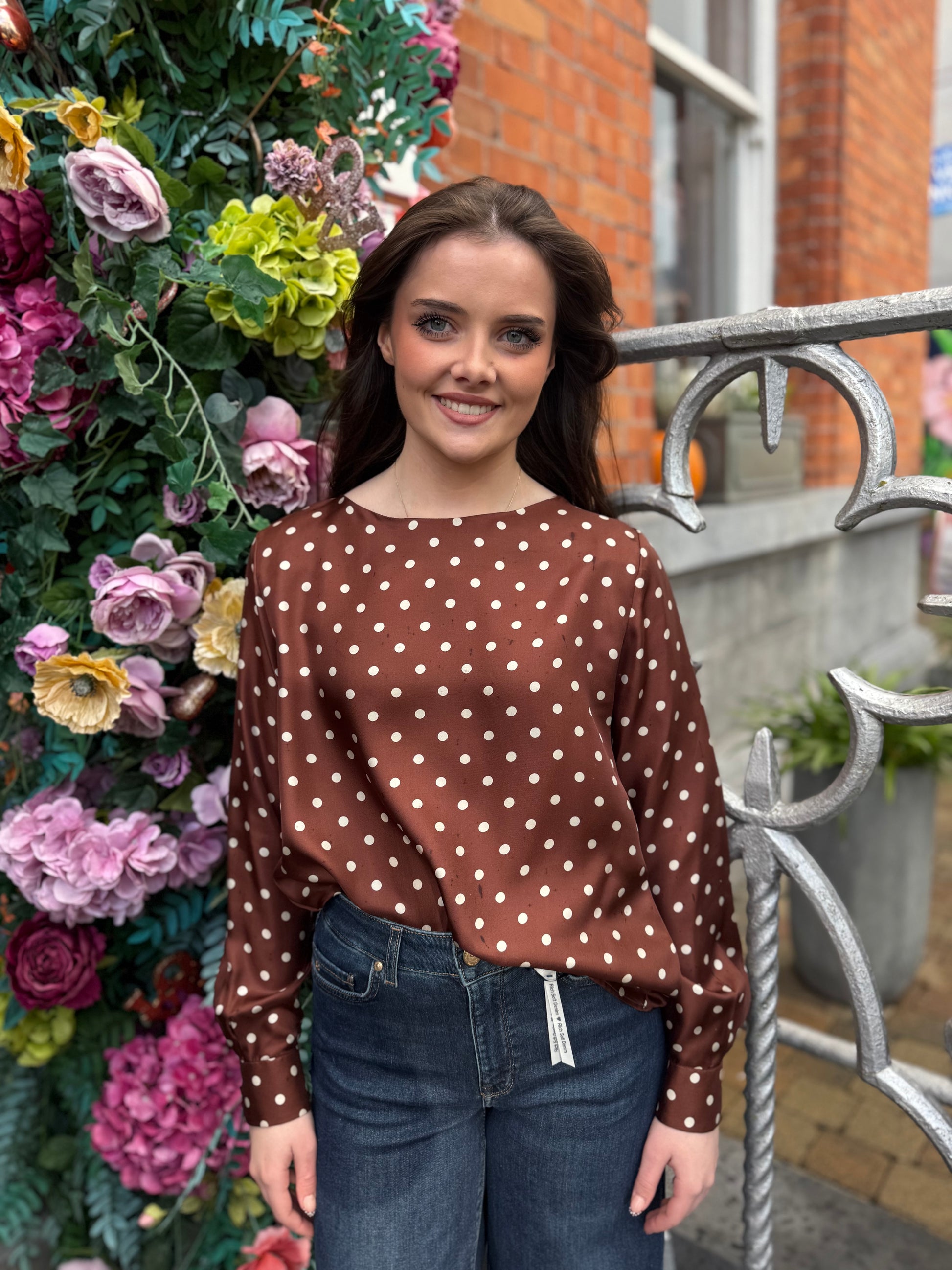 Brown And Cream Polka Dot Top in silk. This is a very simple but elegant top and very on trend at the moment with the colour way of rust brown and cream