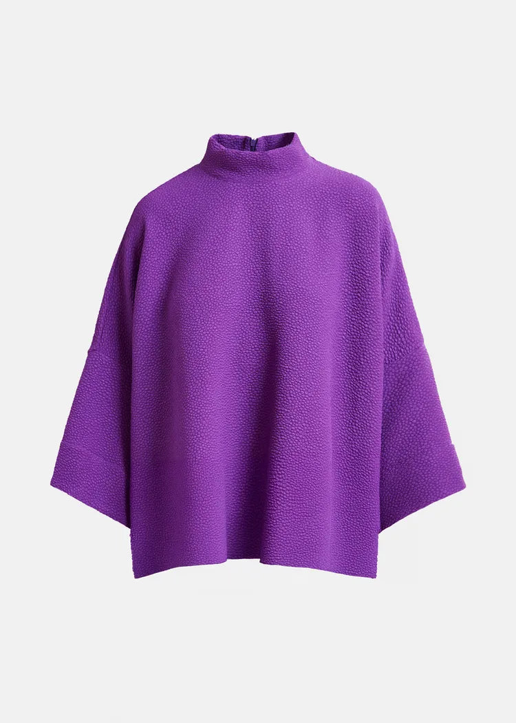 Kimono-like, oversized top is designed with a stand-up collar, hidden zip fastening at the back and wide 3/4 length sleeves. It is made from a recycled polyester-stretch blend fabric, woven with a subtly textured finish, blending comfort with style seamlessly.