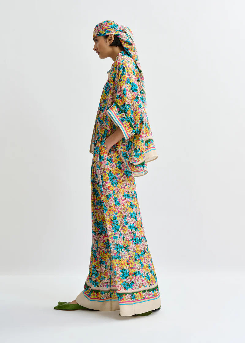 Floral-print shirt crafted from a fluid silk-blend, designed with an intentionally oversized silhouette that drapes effortlessly over the body. The wide 3/4 sleeves enhance the relaxed shape, while the button fastening adds a refined and functional detail. A lightweight construction ensures an elegant flow and ease of movement.