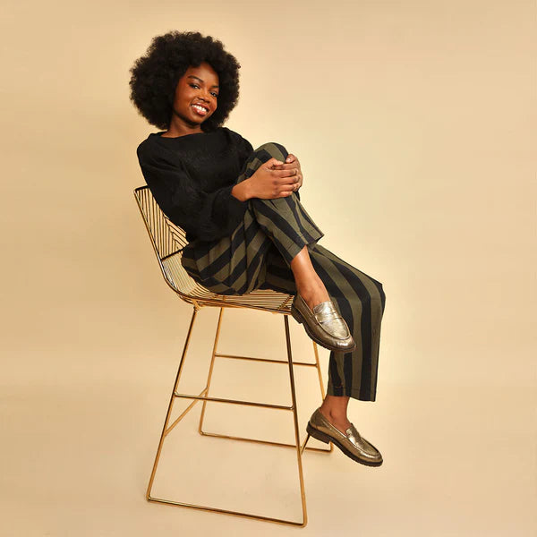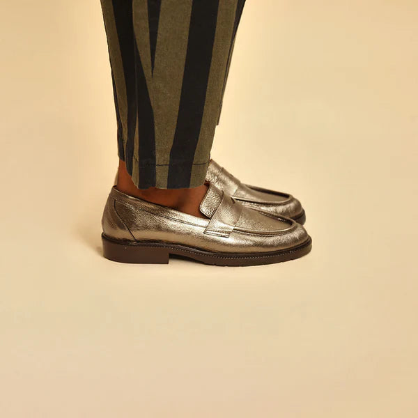 Add a splash of sparkle to your step with the Kath Metallic Smoke penny loafers. Made from shiny metallic smoke leather, these fun and flat shoes offer all-day comfort with a sturdy rubber sole. Perfect for work or a night out, they bring a playful shine to any outfit while keeping you comfortable and confident.