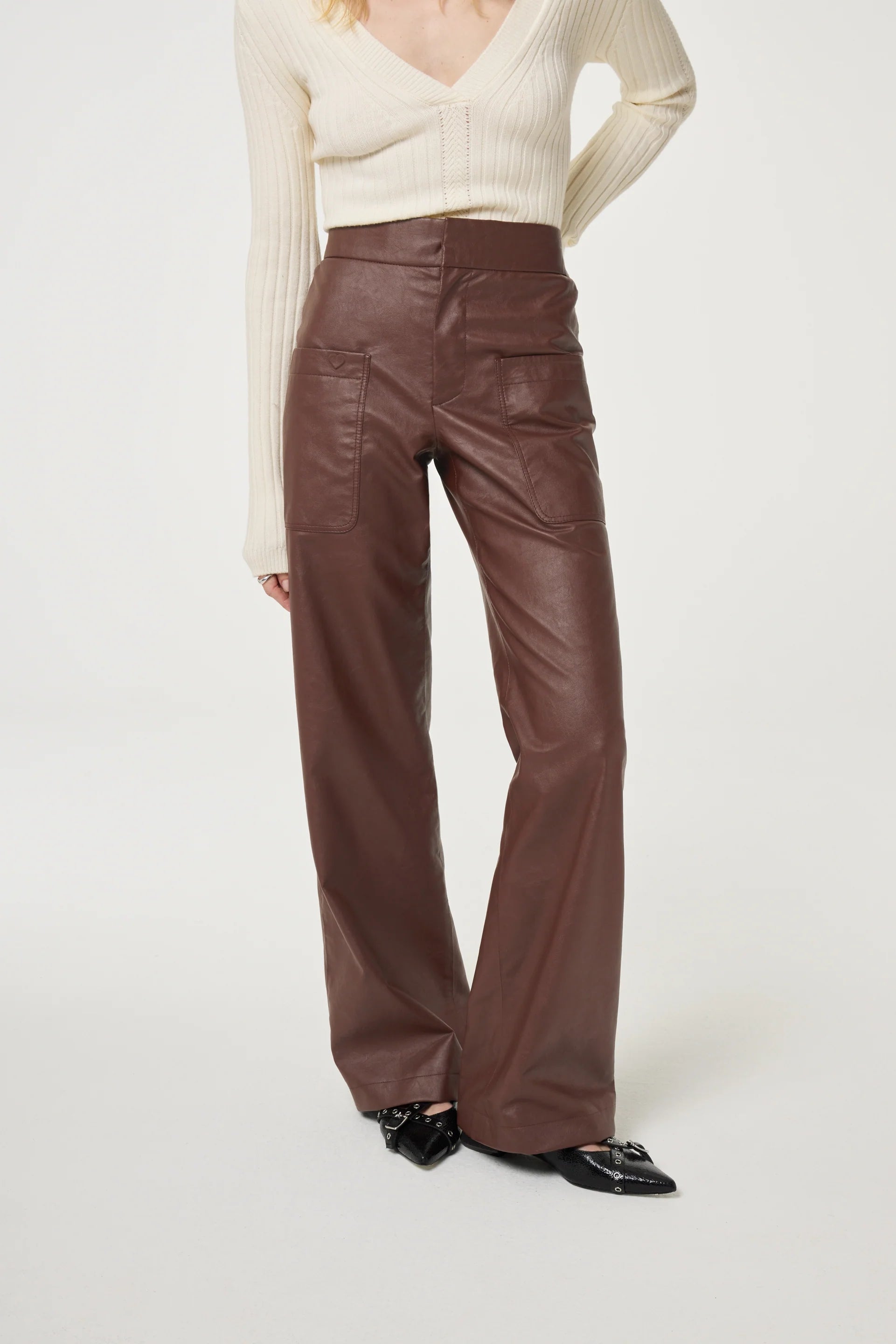 This brown leather-look trouser has a straight, structured silhouette with an edgy twist. Made from 100% polyurethane, it retains its shape and has a smooth, polished finish. Pair with casual tops for everyday style or with tailored pieces for a trendy look.