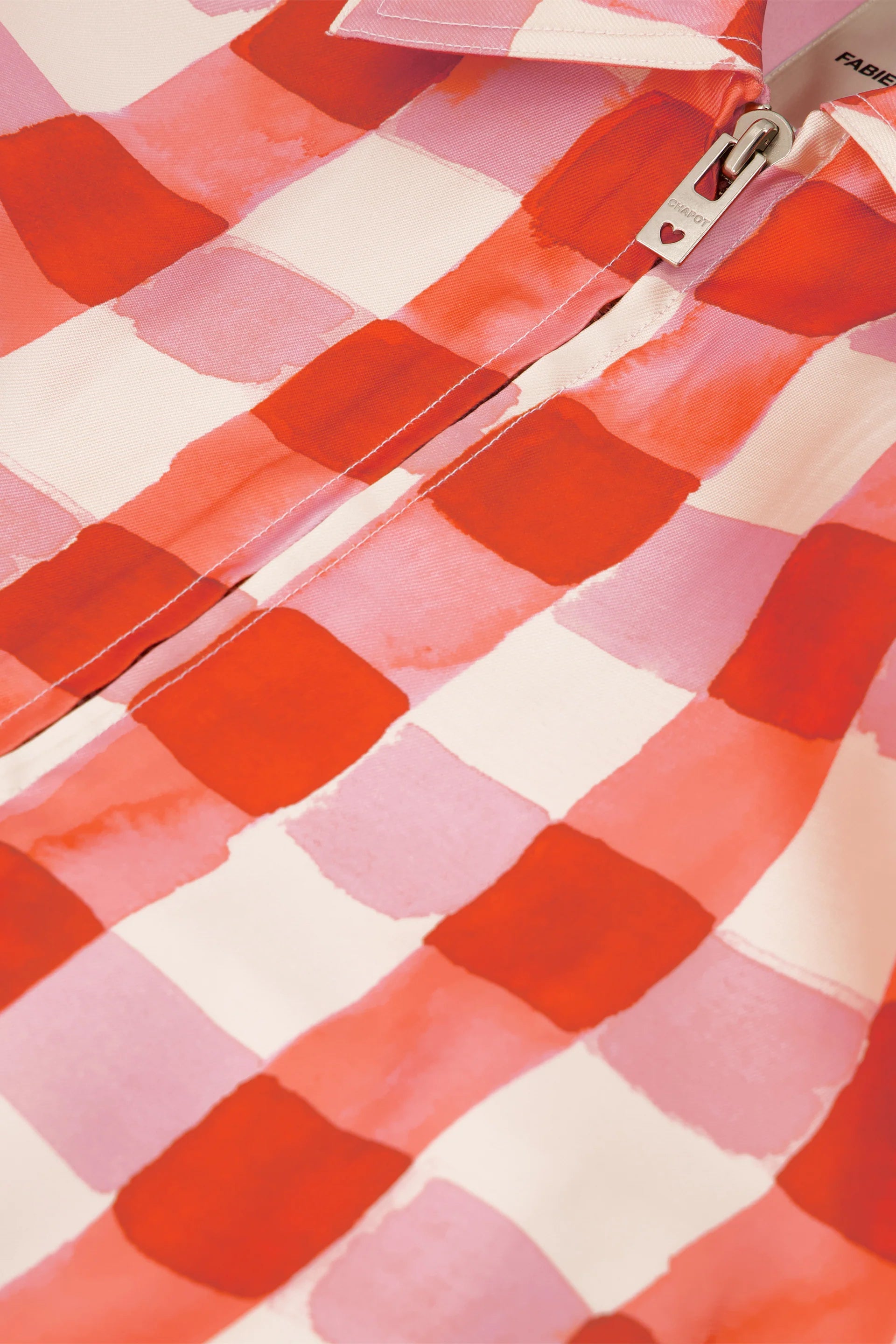 This short jacket features a vibrant orange and pink checkered pattern for a bold, playful look. Crafted from 100% recycled polyester, it offers a lightweight, eco-friendly feel, while the loose fit ensures effortless comfort. Perfect for layering over casual outfits or adding a pop of color to your wardrobe.