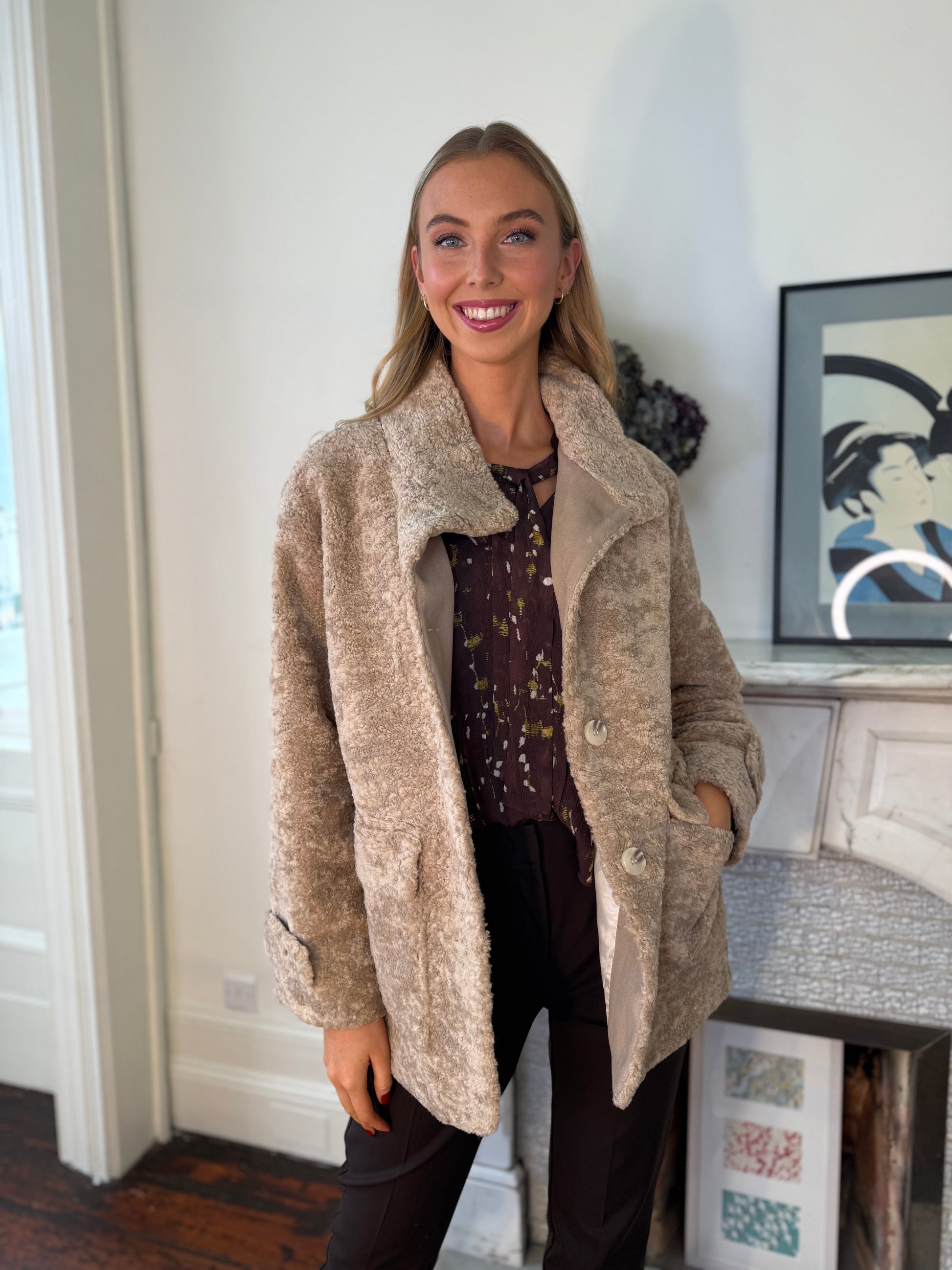 Maddy faux fur beige teddy Jacket. High neck . Two flap pockets at the front Buttoned through. longer length jacket to keep you cosy. Relaxed fit. Size down for a neater fit.