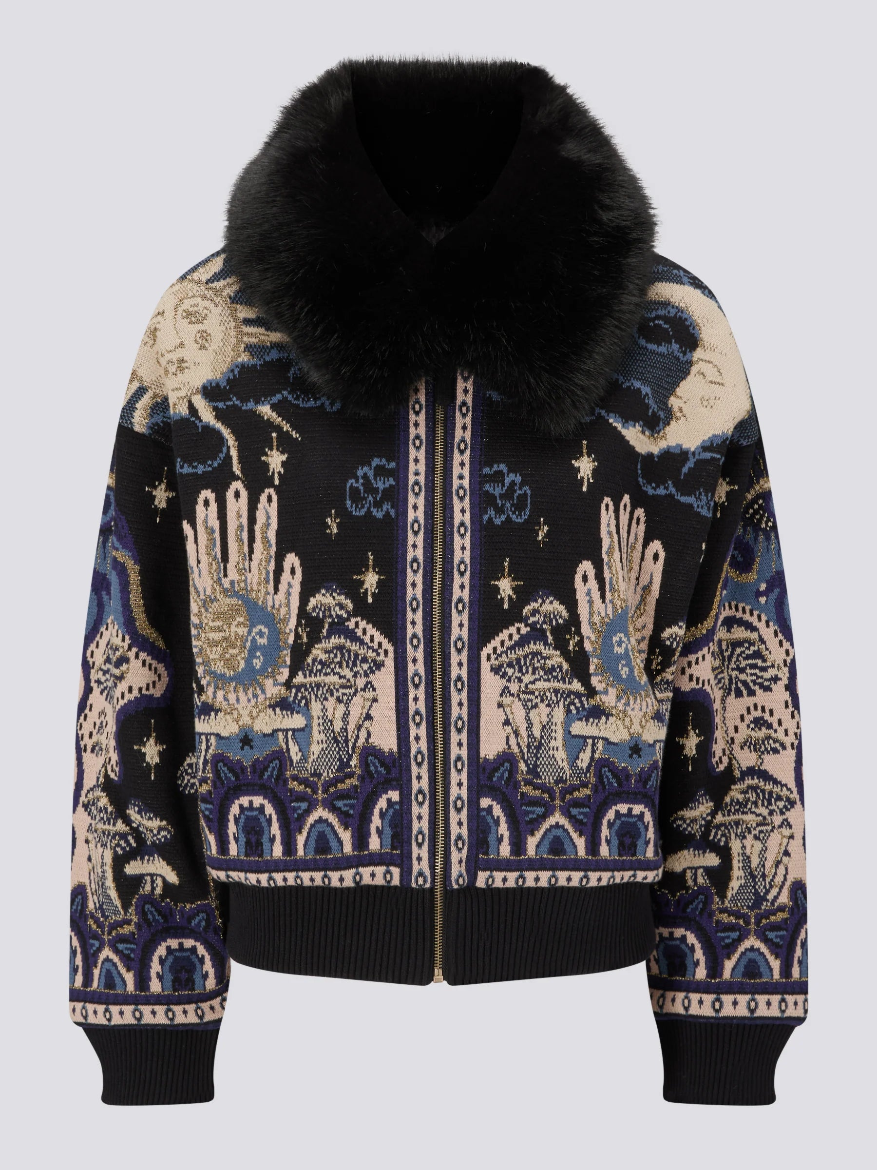 Our cult printed bomber jacket is back and better than ever in our new Written in the Stars print. Shimmering celestial symbols, inspired by travel and the unknown, adorn this black faux fur collar jacket. Ideal for days that need a little extra layer - just add jeans.