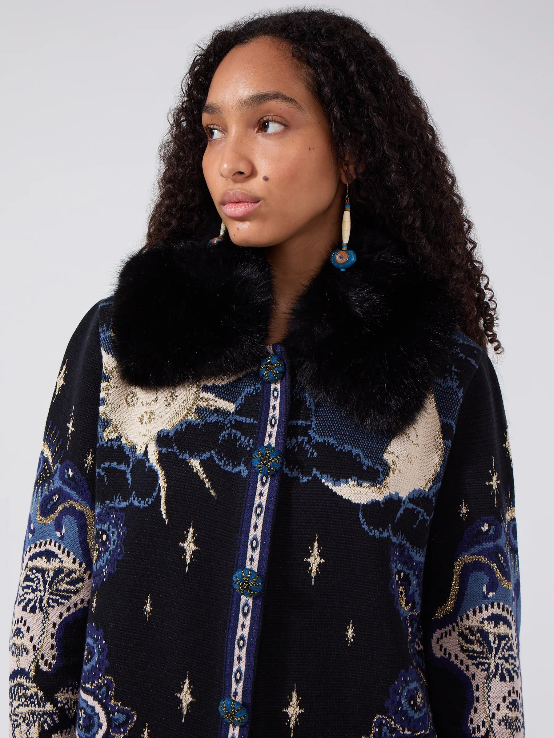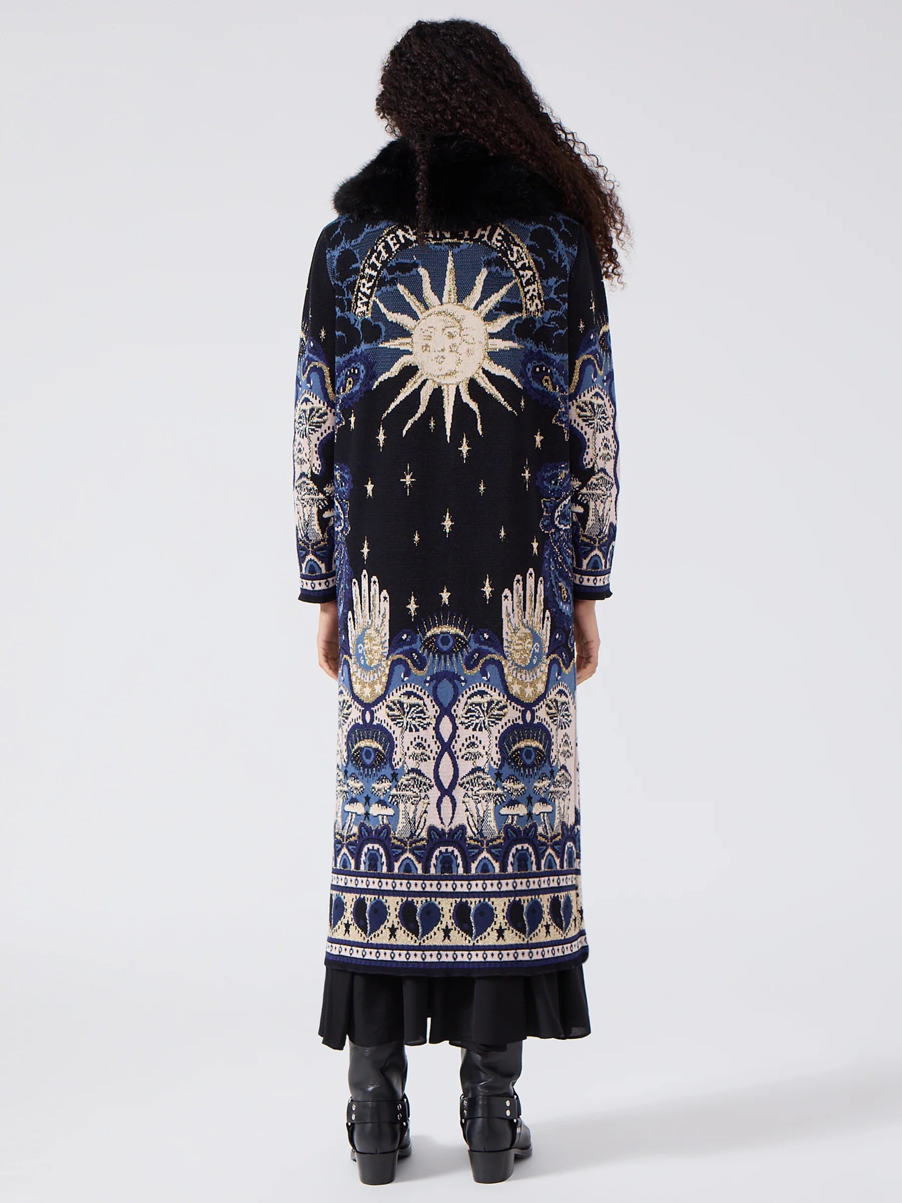 This signature full-length knitted coat features our hand-painted Written in the Stars design - a tapestry of eyes, hands, stars and florals, inspired by exploration and global cultures. Elevated with shimmering lurex and finished with a plush faux fur collar, this long jacquard coat is a versatile companion for life’s greatest adventures. Just add jeans.