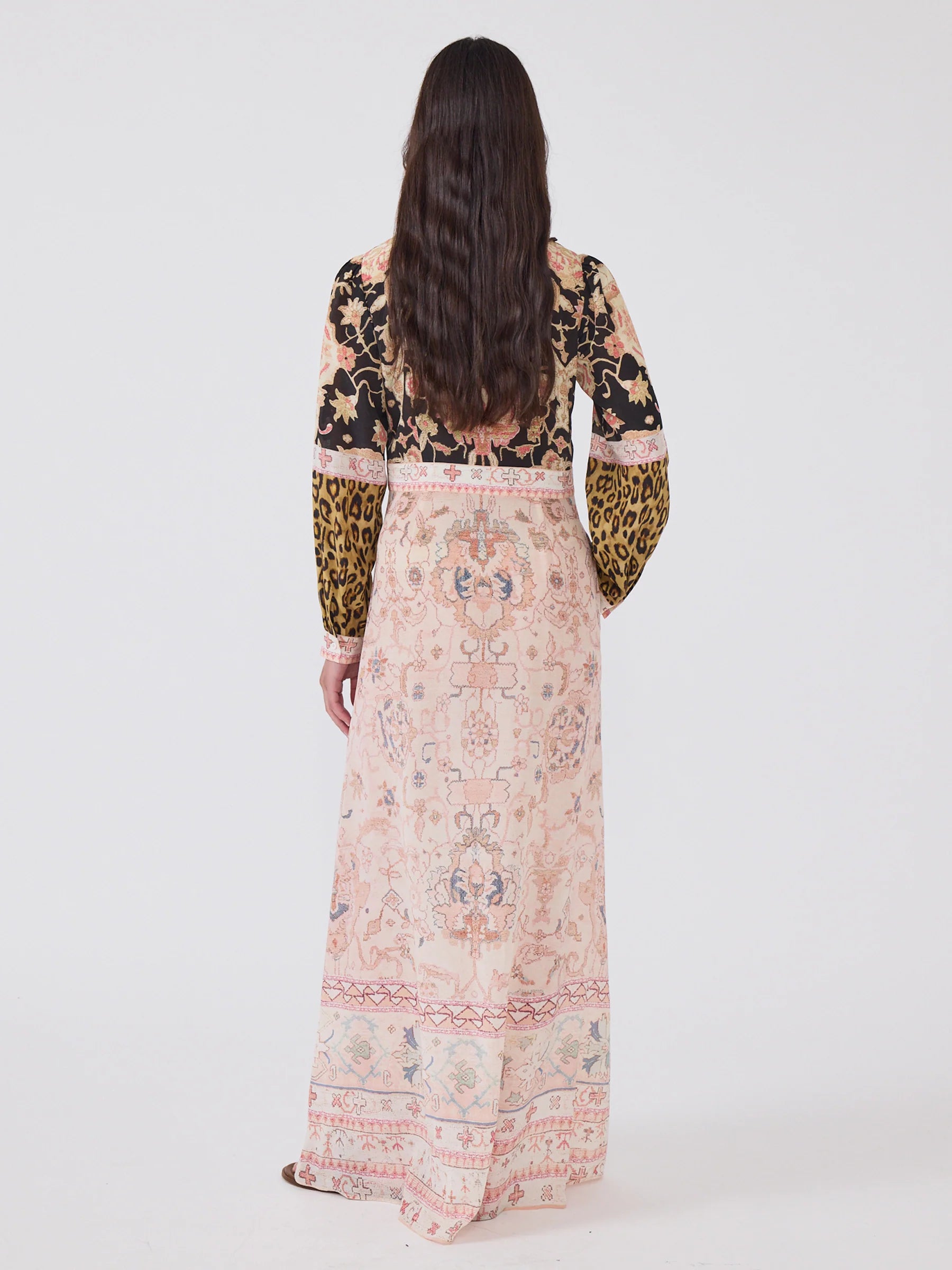 A true Hayley Menzies signature, the silk shirt dress returns in this season’s Desert Loom print - a celebration of Hayley’s love of antique rugs. This maxi shirt dress boasts a placement print featuring pink and black tapestry-inspired panels clashed with leopard print for a bold, confident finish. Tailored at the waist to flatter and fluid through the hips, this shirt dress is designed to move with you - from dressed-down days with boots to after-dark with heels.