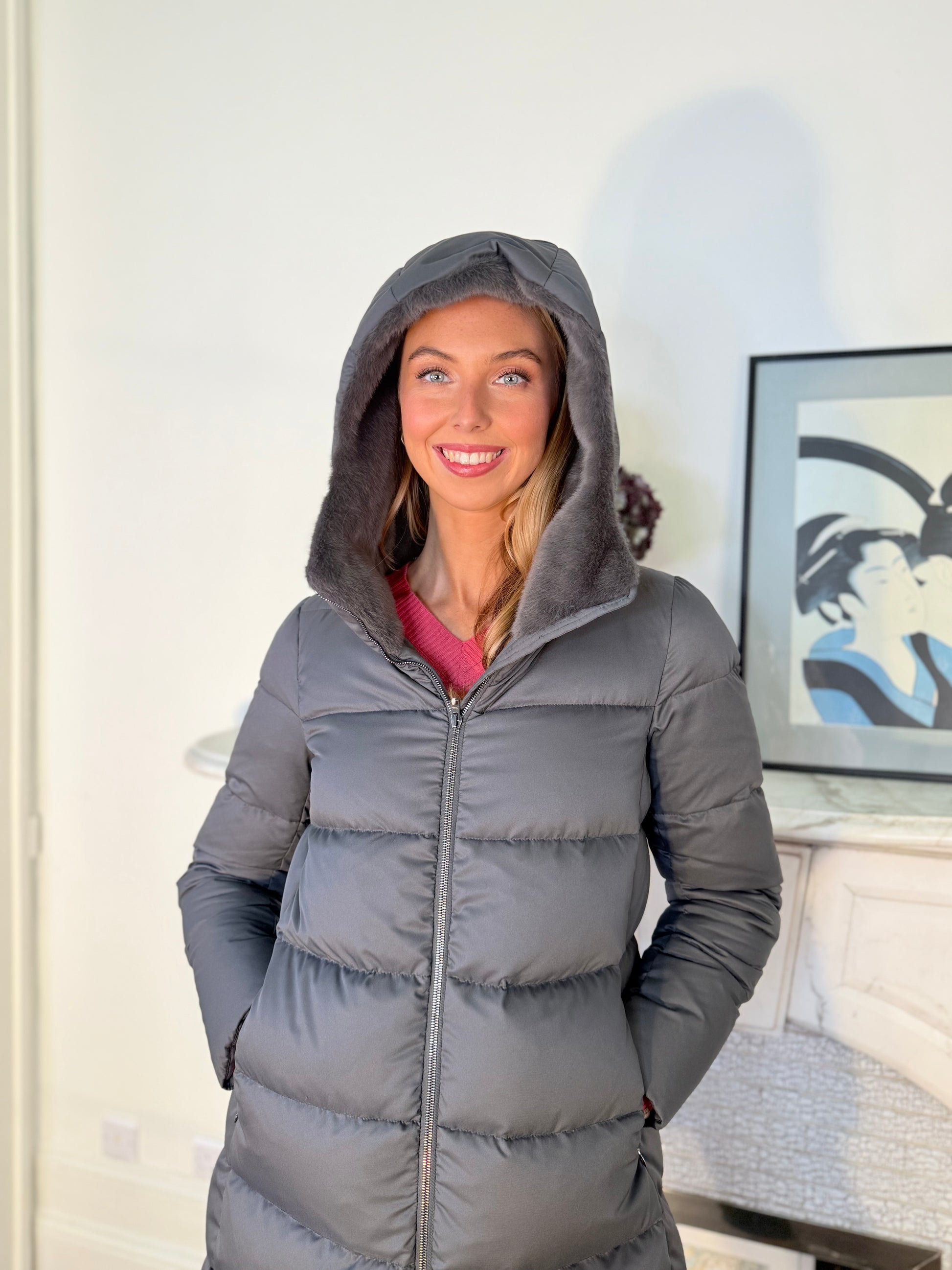 Herno Arendelle A-Shape Grey Quilted Jacket with Faux Fur Lined Hood