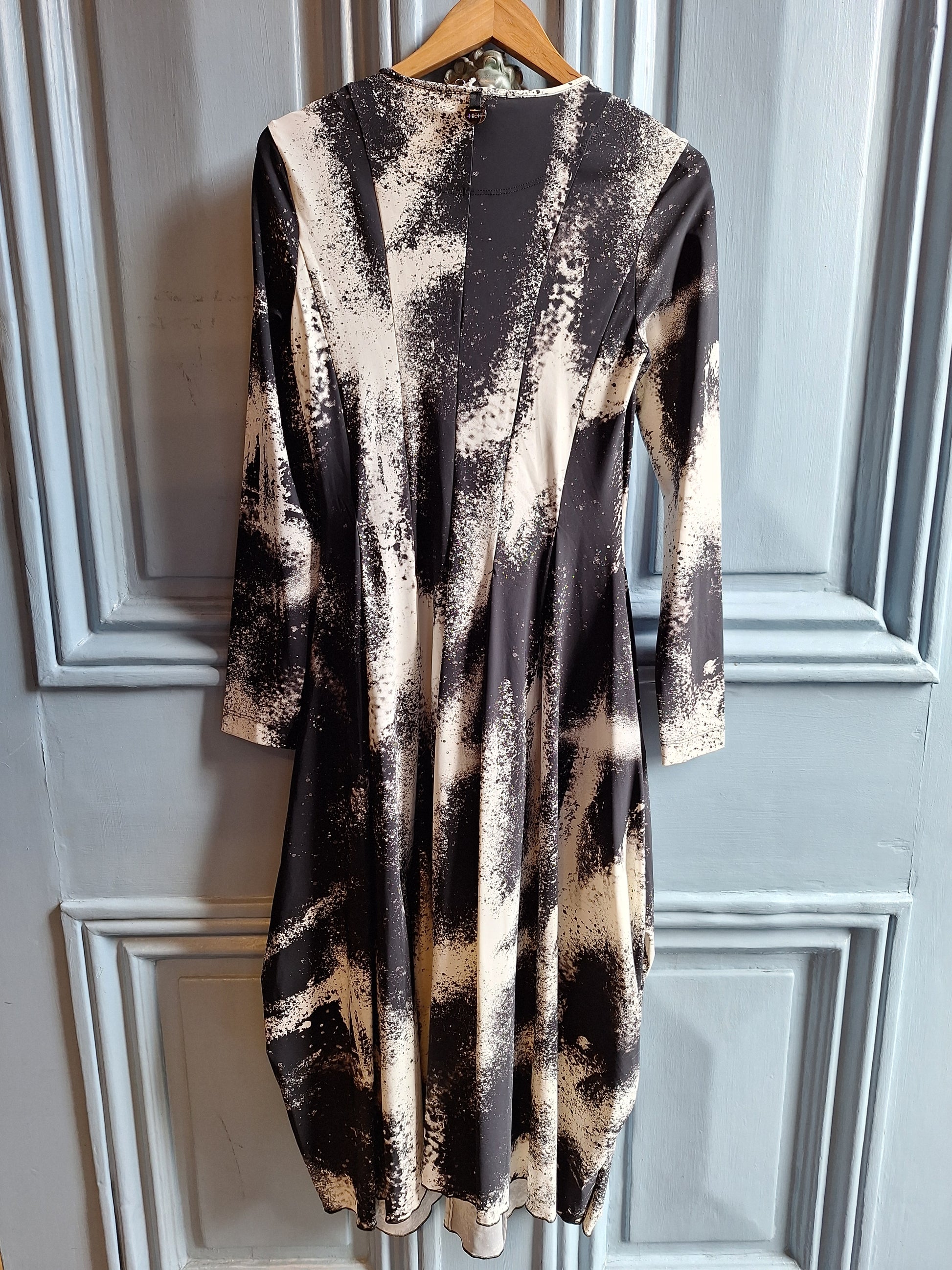 Signature-style dress in black and white floral printed Sensitive®* jersey. Wide round neckline bounded in self fabric. Multi-seamed fitted bodice. Long skinny sleeves in different patterns. Full skirt with inseam pockets, curved side panels and pleats at side front and across back. Skirt has curved side seams and side gatherings creating a full "balloon" skirt. Reverse has multi seams bodice opening at waist in multiple pleats