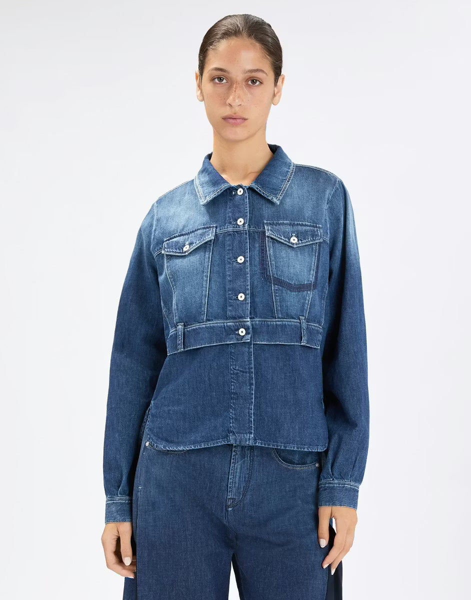 Majorette blurs the lines between a denim jacket and a shirt, combining classic outerwear details on the upper half with shirt-like elements on the lower. A contemporary piece that can also be worn open over a T-shirt for a casual-chic vibe. Turned-down collar. Double front button closure with one side visible and the other concealed. Long sleeves with buttoned cuffs. Flap pocket with button on the chest. Belt loop detail at the waist. • Cotton, lightweight, soft handfeel. • TREATMENT: the garment features manually created shaded areas and abrasions. It is enzyme-washed to achieve a vintage effect. Variations in tone and intensity are part of the artisanal process. Each piece has a unique look due to the treatment.