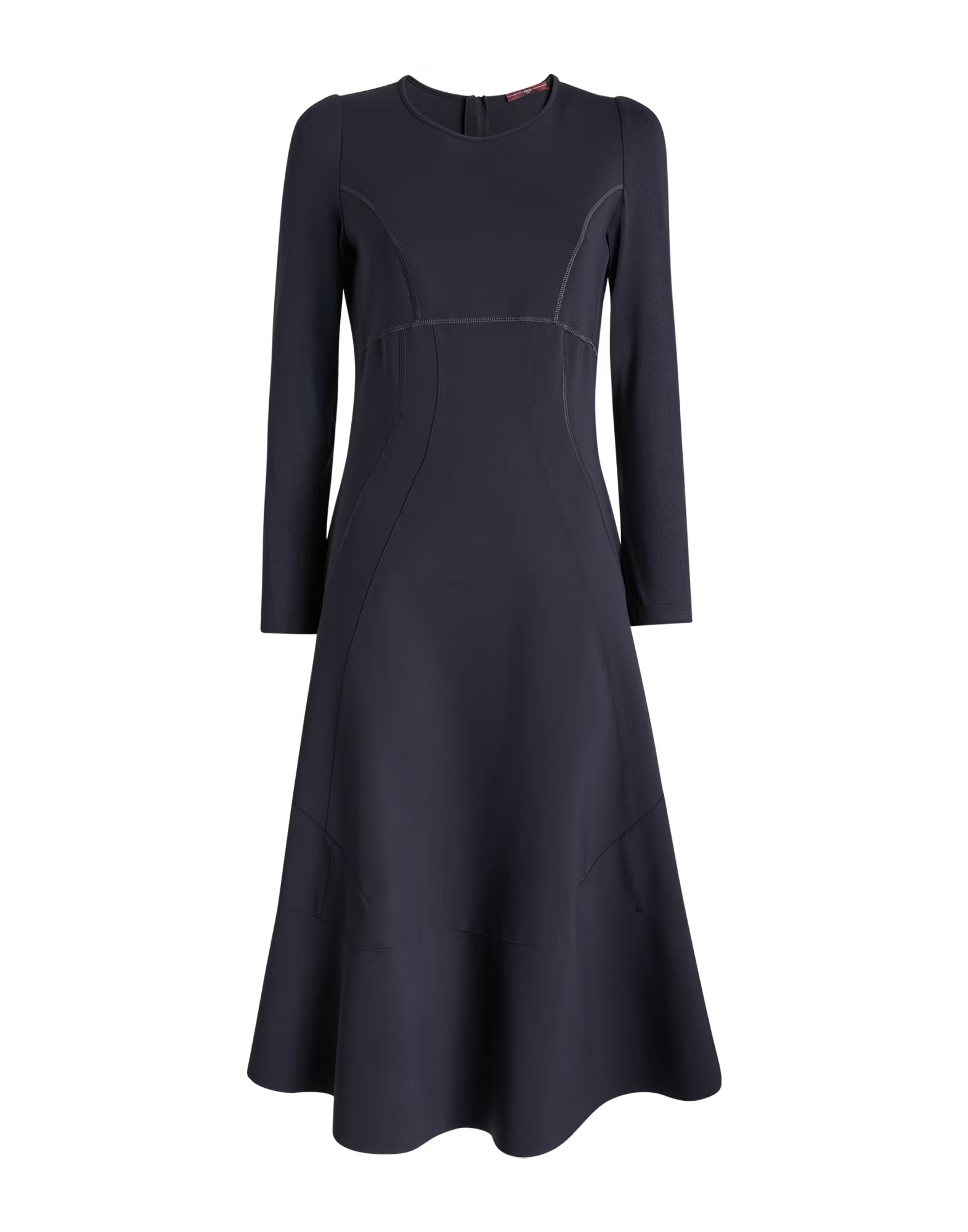 The Synchro dress is a minimalist everyday piece with a classic empire cut: the upper part is more fitted and defined by exposed seams, while the flared lower section adds a practical, modern touch. Crew neck. Long sleeves. Back zip closure. Side slit pockets. Exposed seams. Asymmetric hem. • Stretch polyamide scuba jersey, medium weight, compact handfeel. • Unlined.
