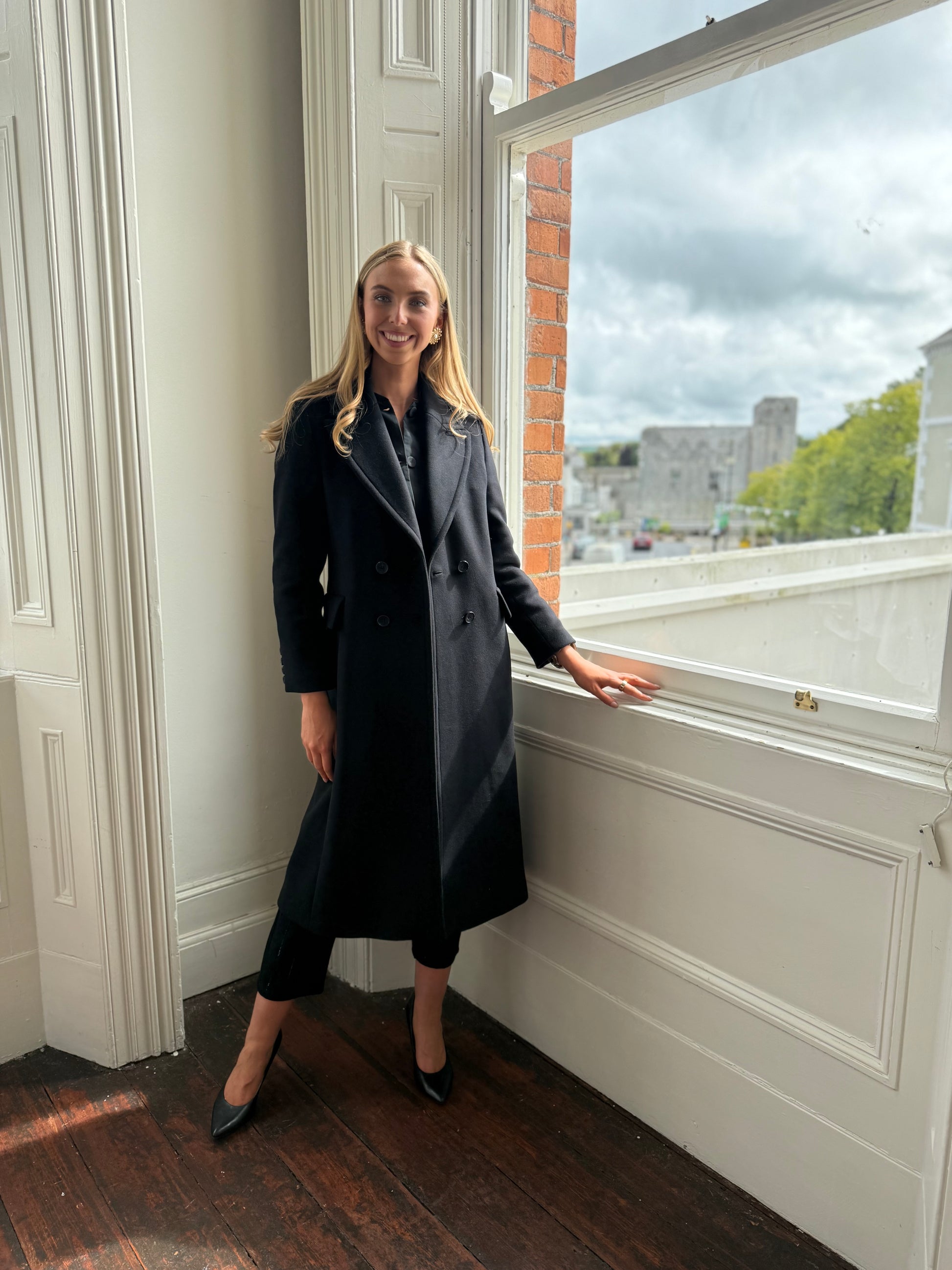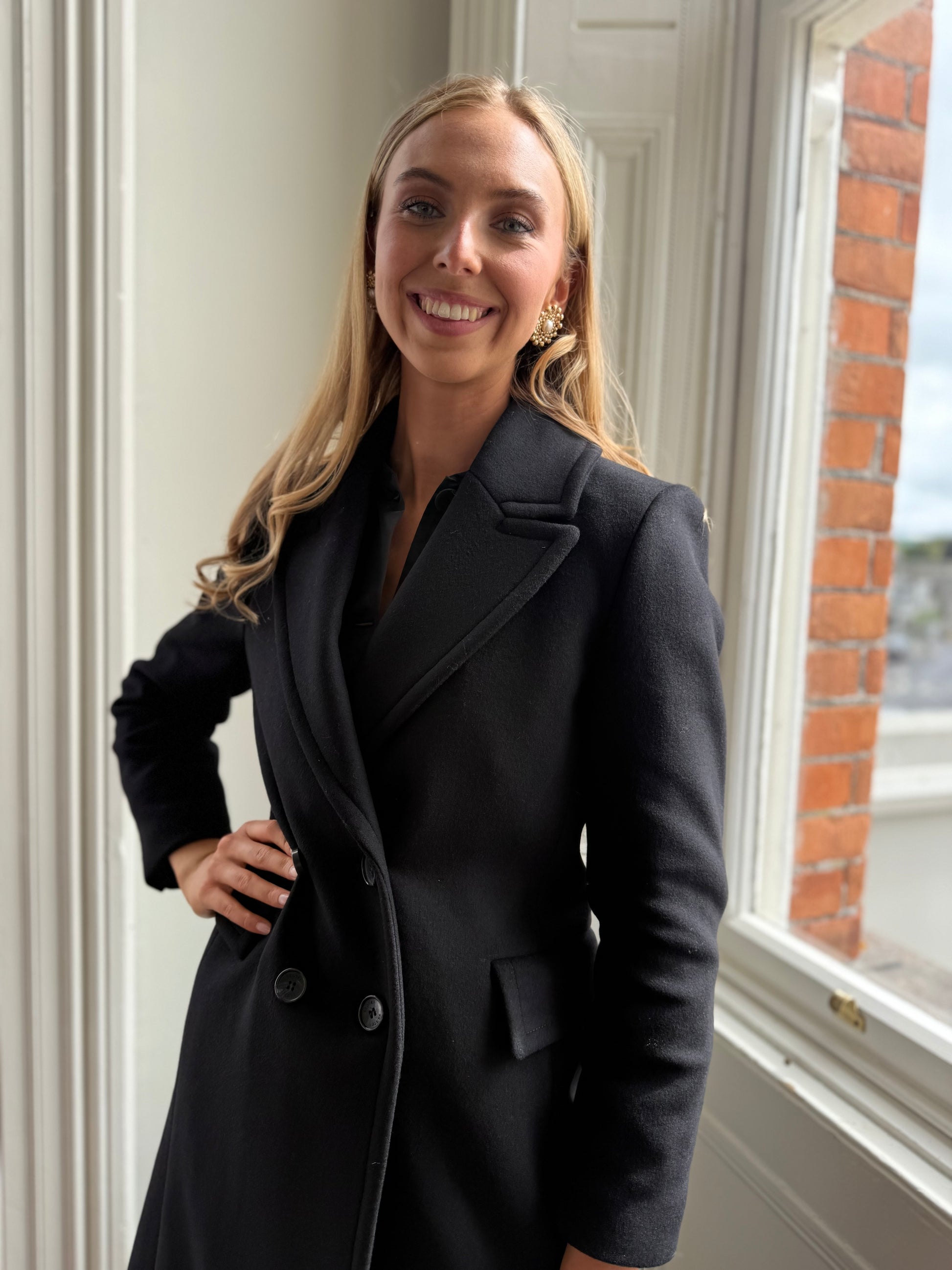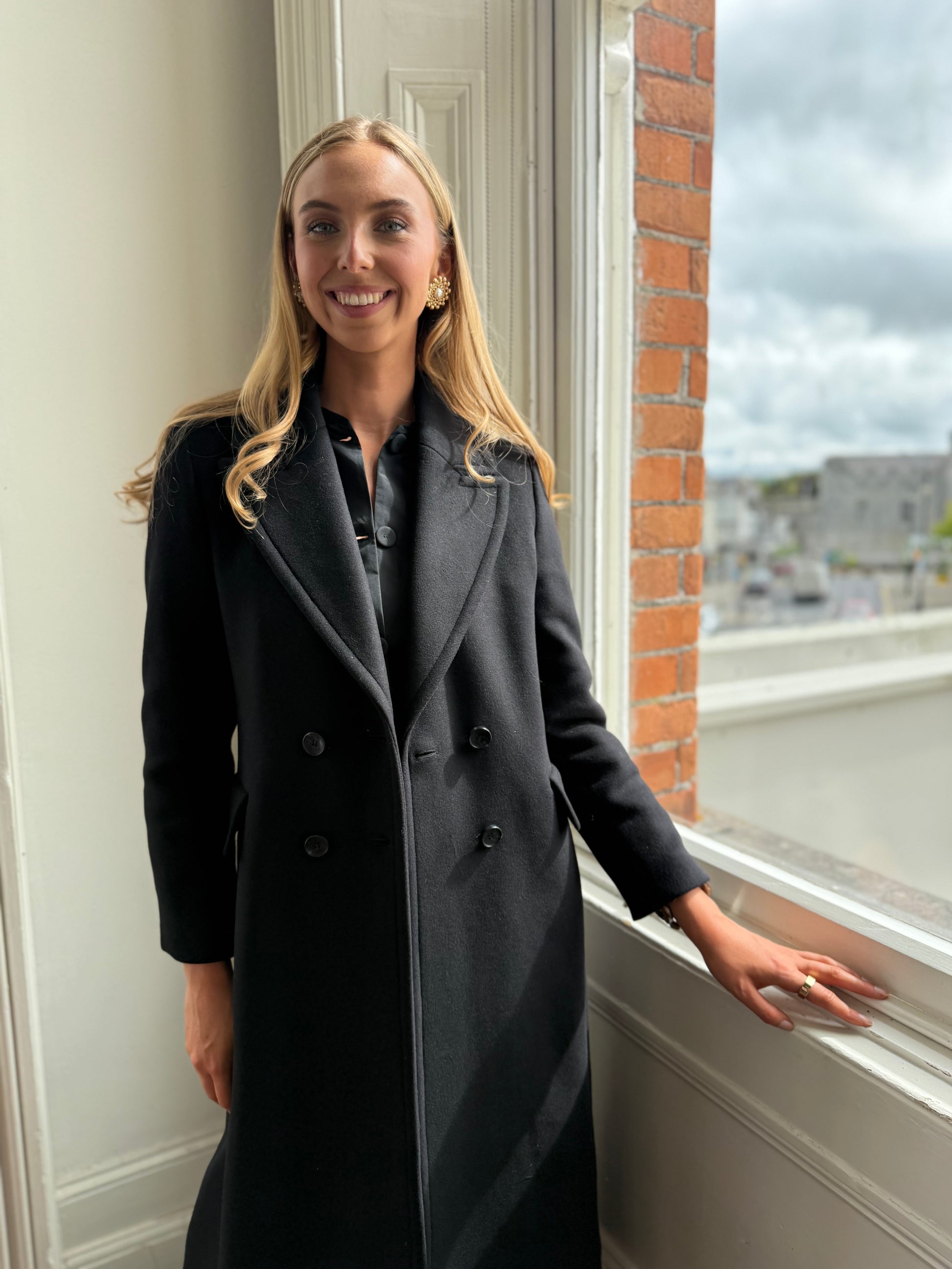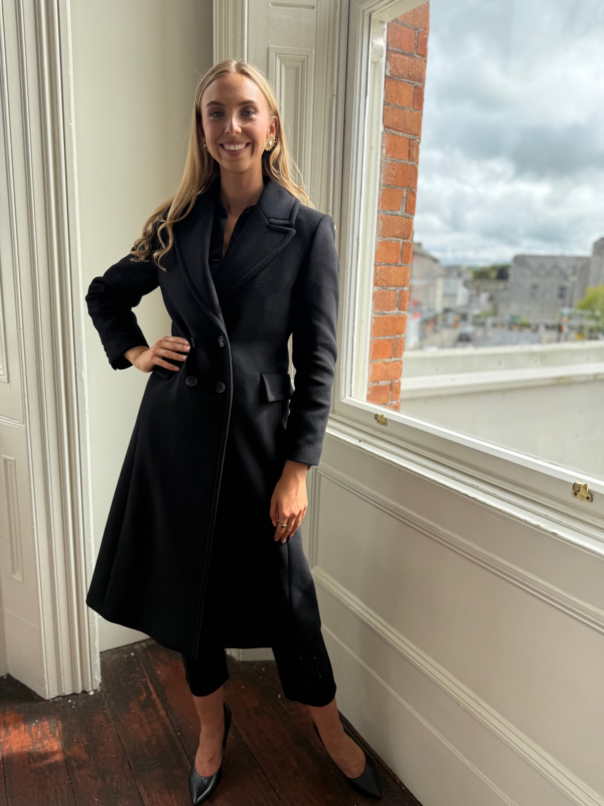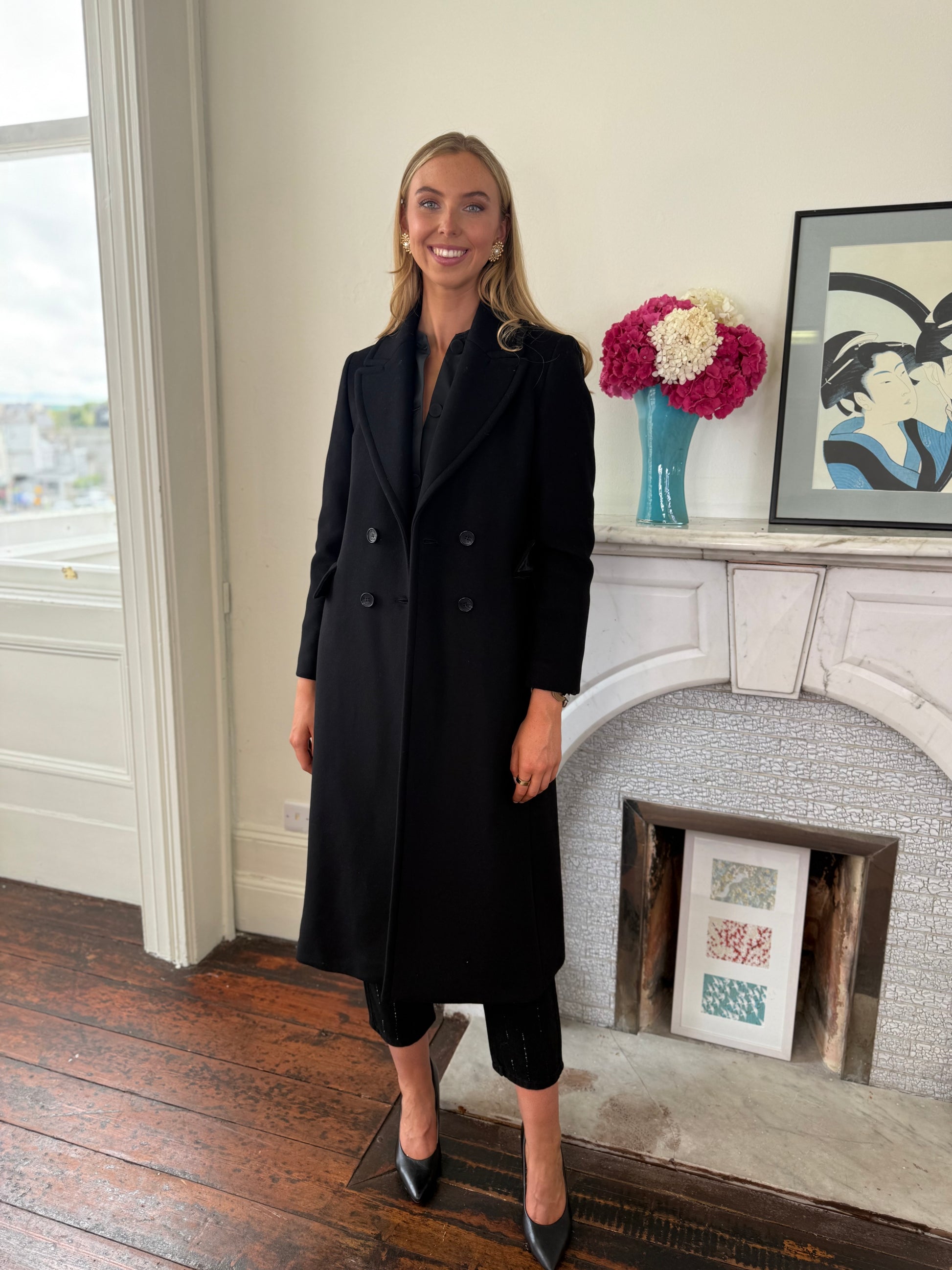 Double breasted midi length classic wool coat in black.. This coat will never go out a fashion. An absolute staple in any wardrobe for many many years to come.