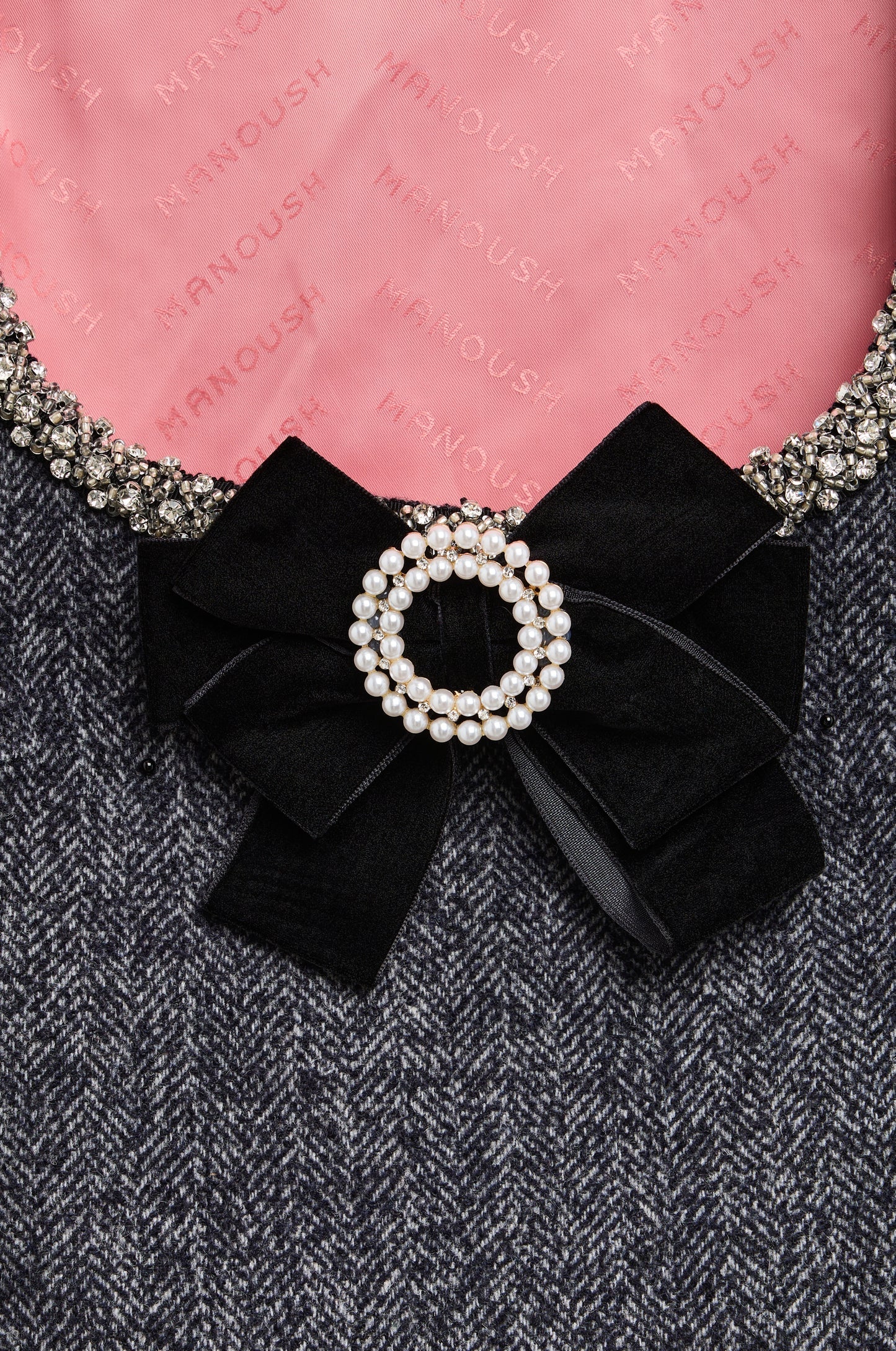 This sleeveless chevron dress is distinguished by refined jeweled embellishments, adding a touch of elegance. A delicate bow at the collar completes the piece with a feminine and sophisticated note.