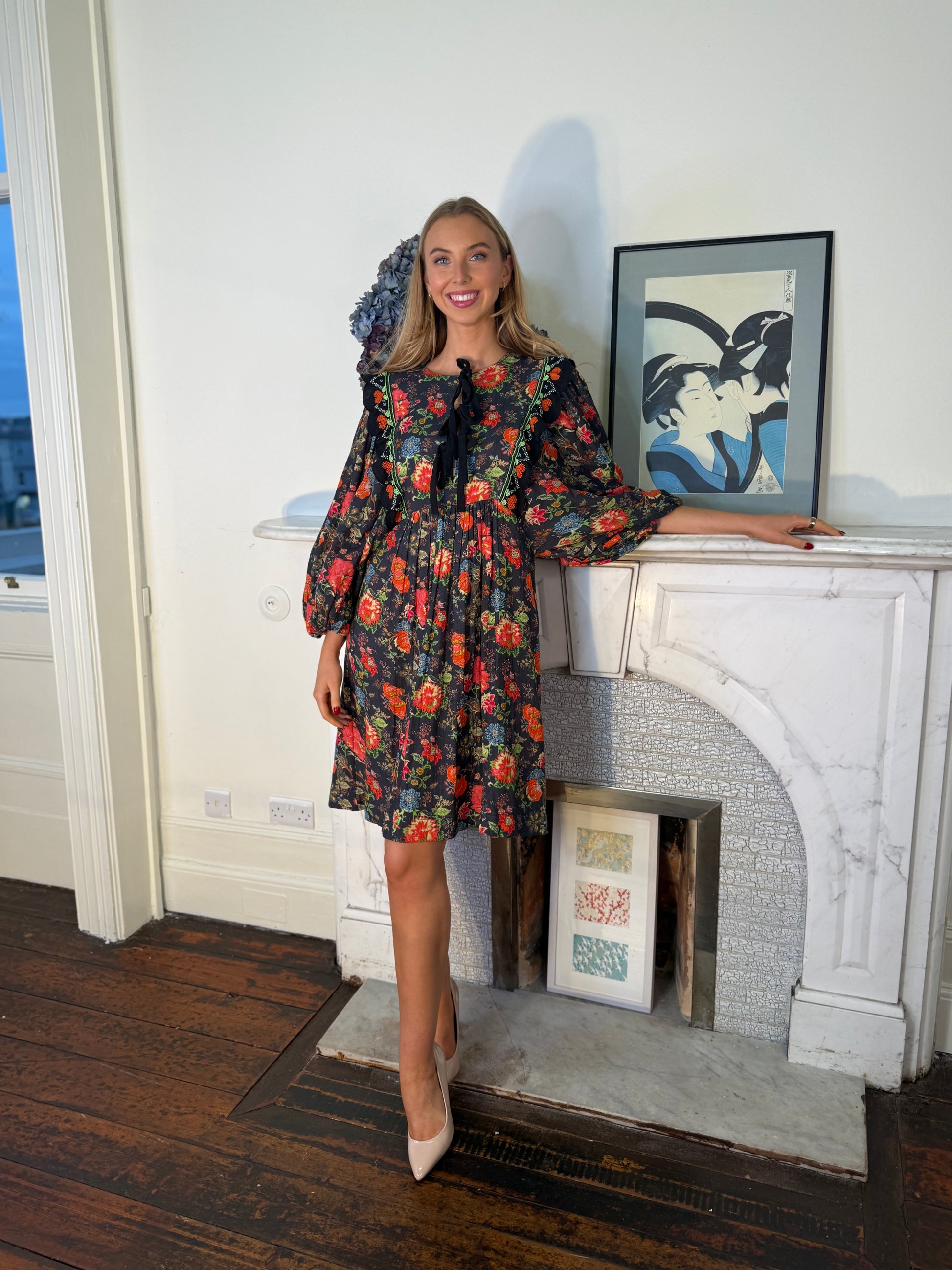 This dress stands out with its ruffled yoke finished with delicately woven hearts, and three velvet bows placed on the upper part, adding a romantic and sophisticated touch to its elegant silhouette.