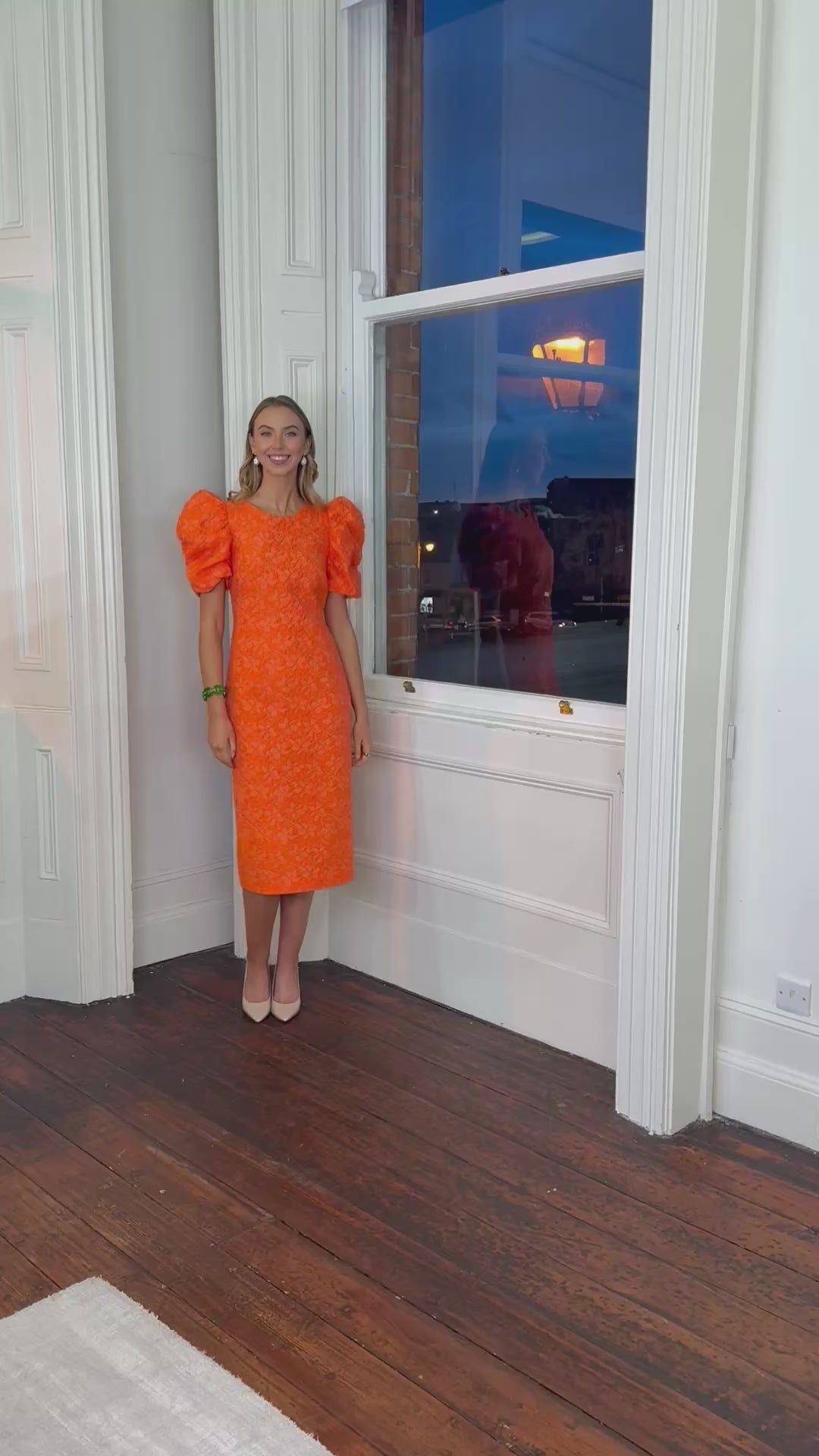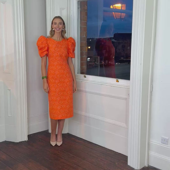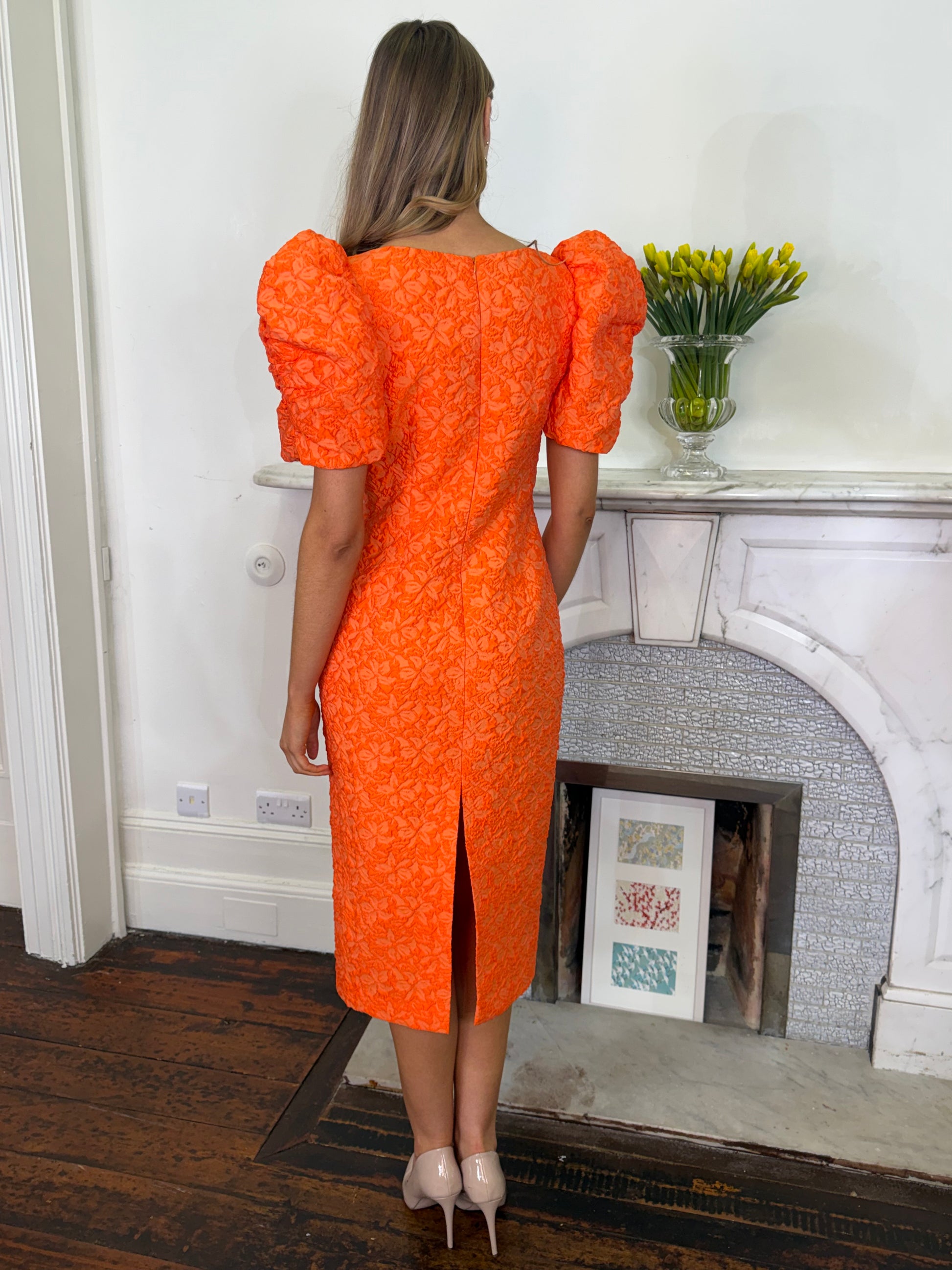 Fitted orange embossed dress with ruched sleeve detail to above the elbow. This is a very striking dress in a fantastic block colour.