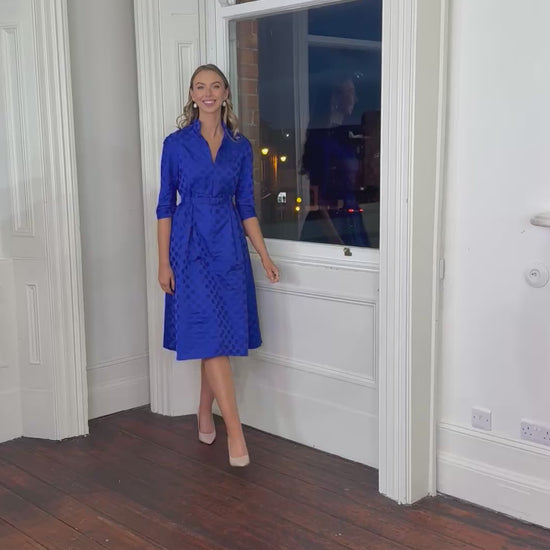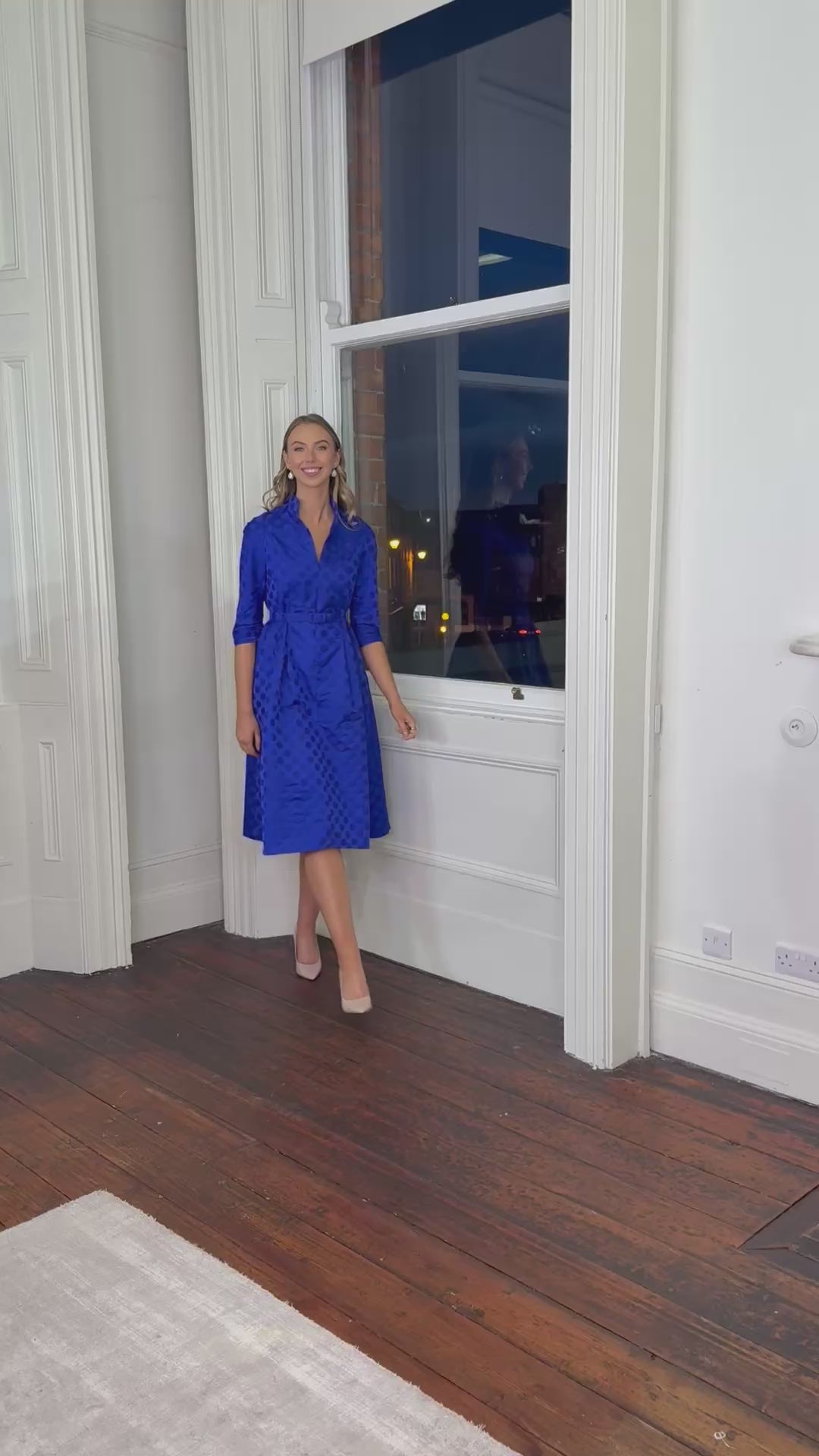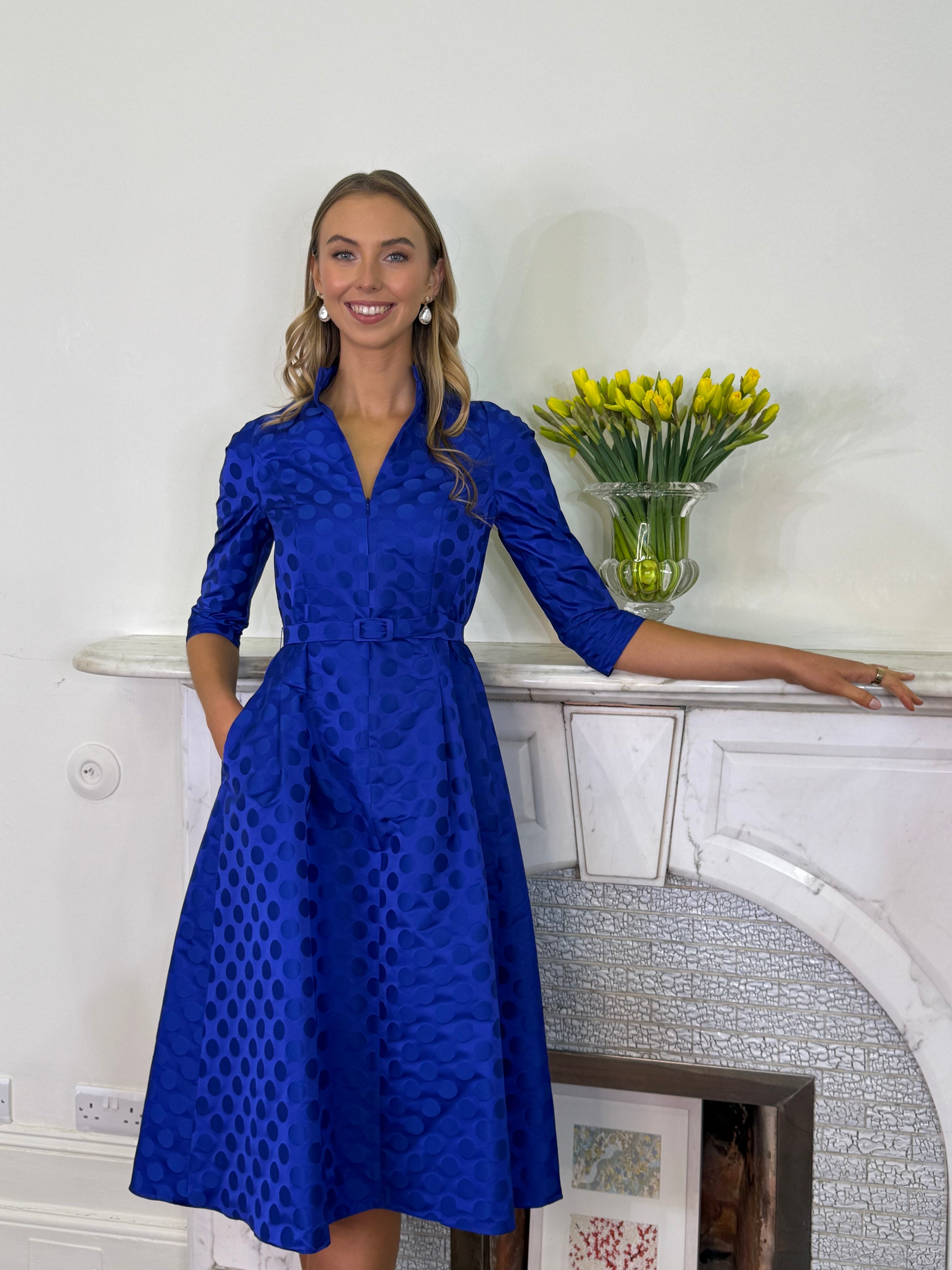 This is such a striking dress in a sapphire blue polka dot embossed fabric in a fit and flare design. This is an exceptionally flattering dress with a zip detail to the front and styled with a self belt.