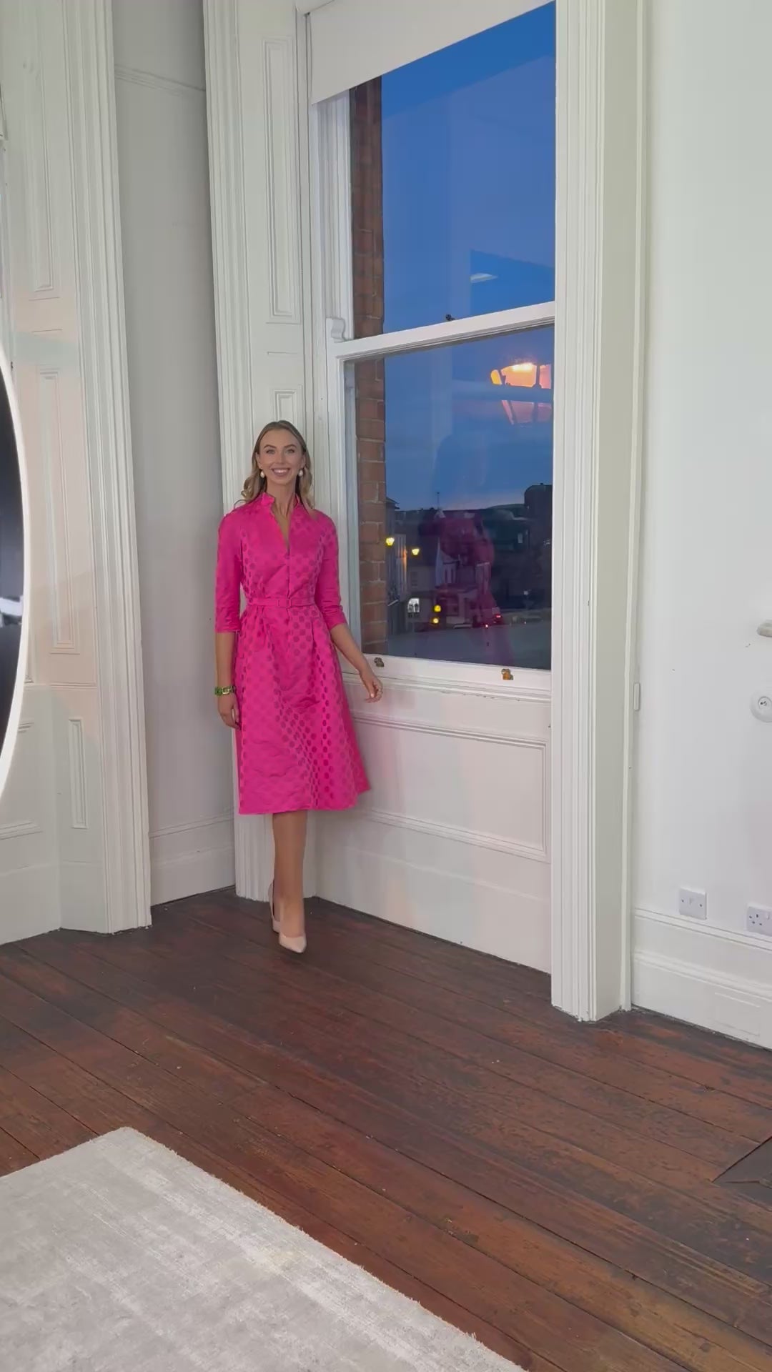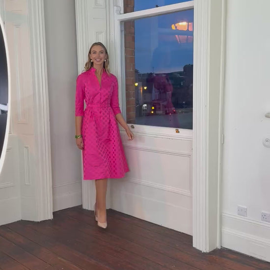 This is such a striking dress in a magenta polka dot embossed fabric in a fit and flare design. This is an exceptionally flattering dress with a zip detail to the front and styled with a self belt.