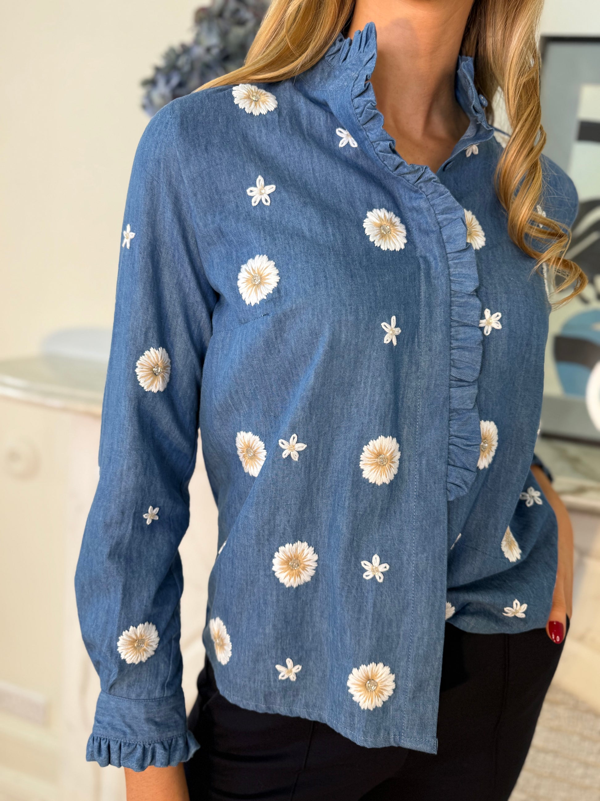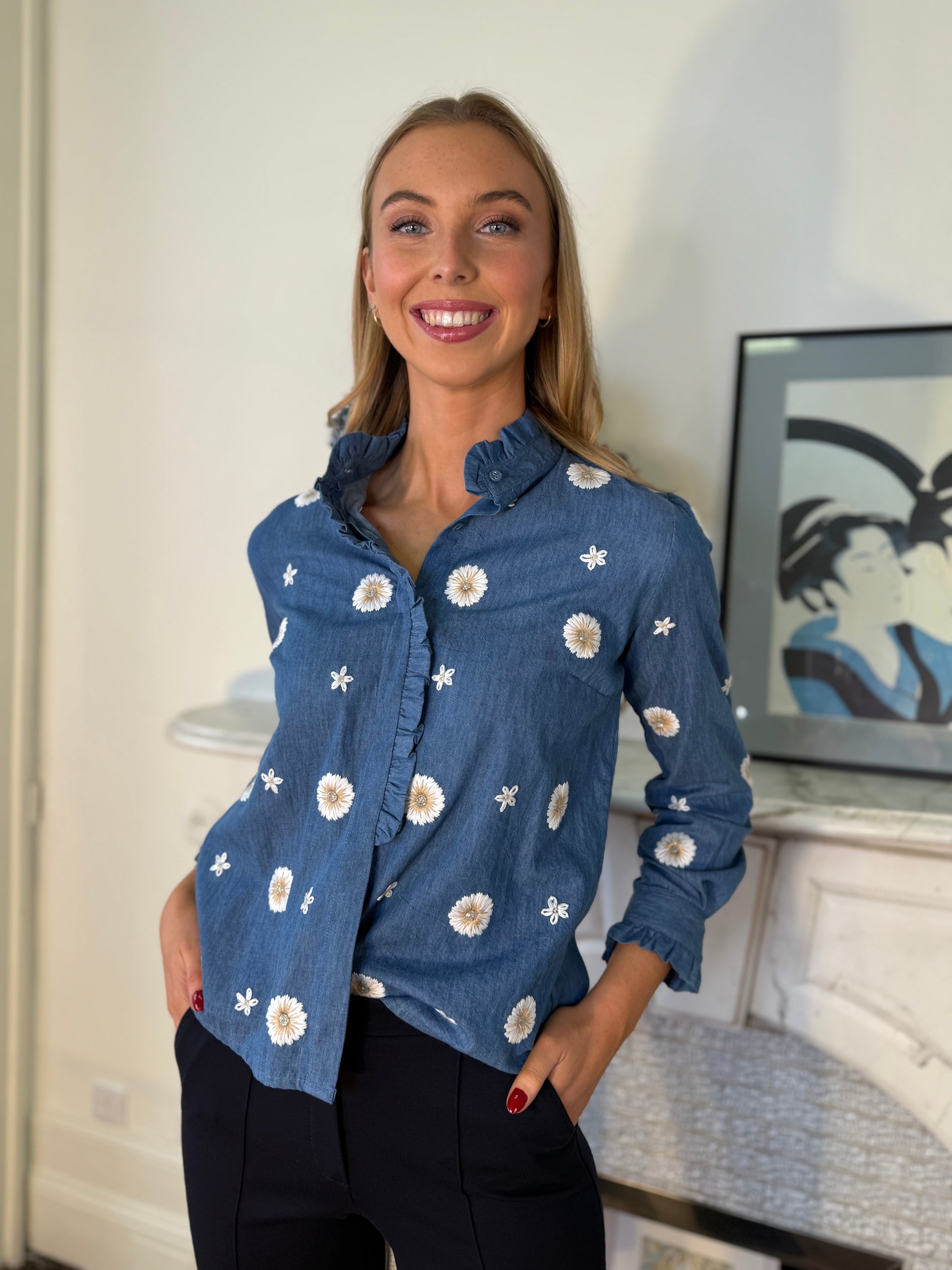 The Florie shirt is crafted from 100% soft cotton in a flattering denim blue tone, adorned with delicate floral embroidery in white and beige. Its high ruffled collar and frill detail along the button placket add a romantic, feminine touch. The cuffs also feature subtle gathers for a refined and elegant finish. Perfect to pair with jeans, skirts, or tailored trousers for a versatile, timeless look.