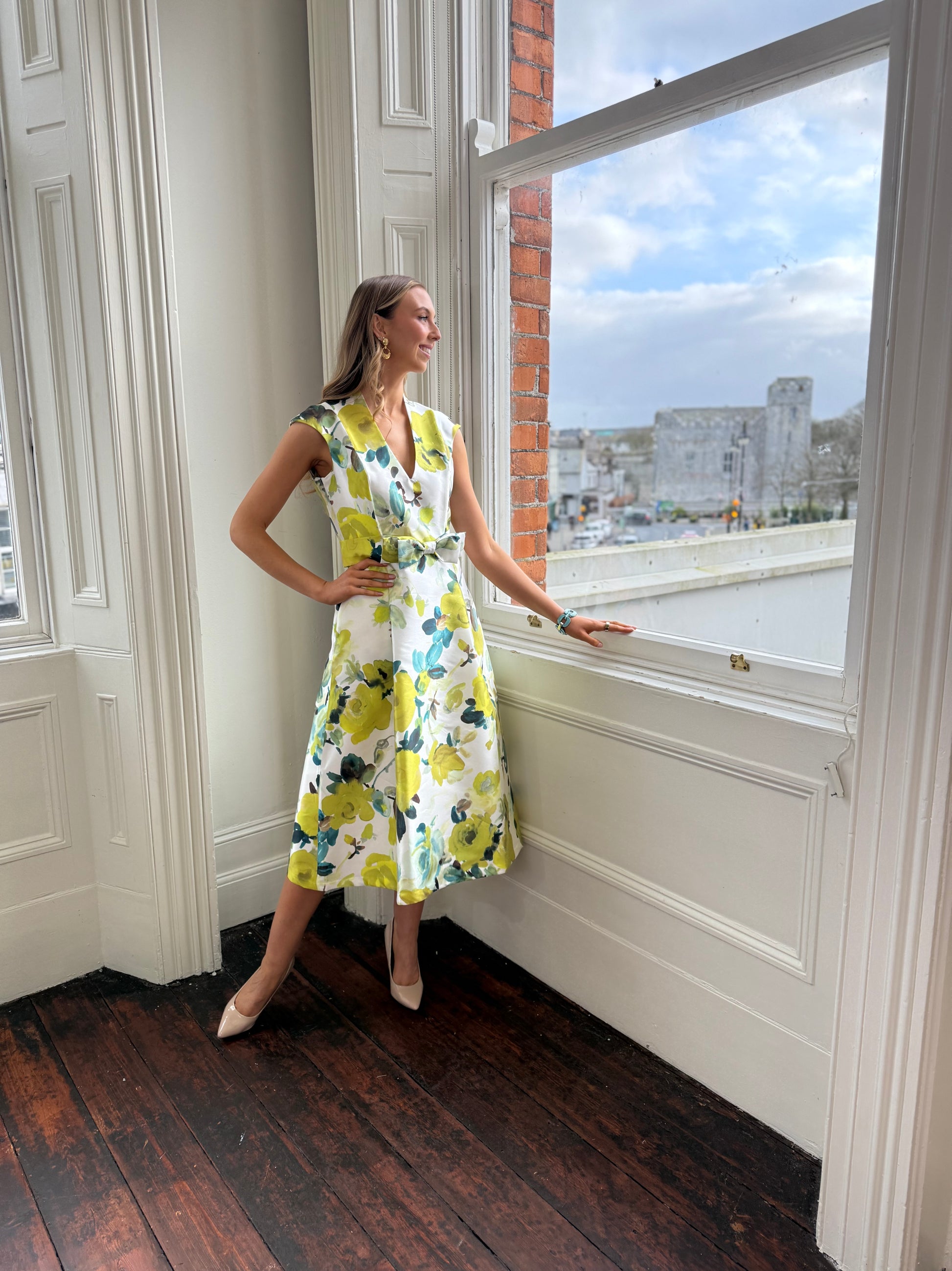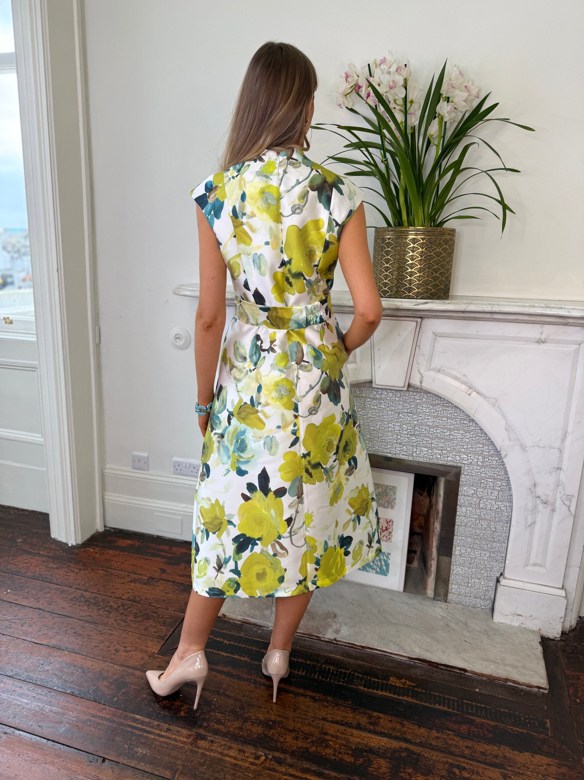 Sara Roka Lime Roses Satin Print Dress with Bow Belt