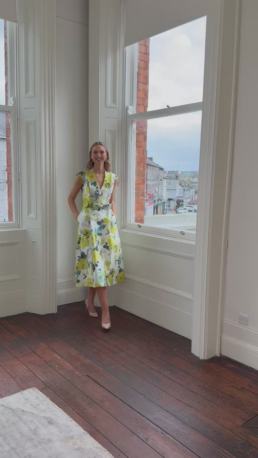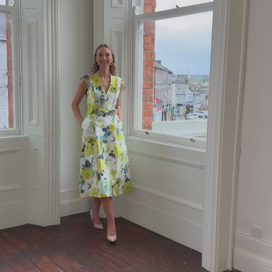 Lime roses satin printed dress with an 1950s influence. V neck with a self belt and bow detail. This is a very elegant dress for a very special occasion.