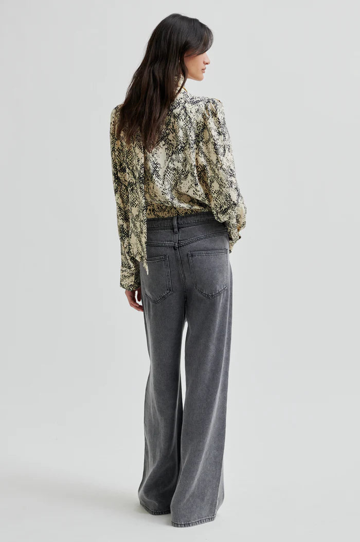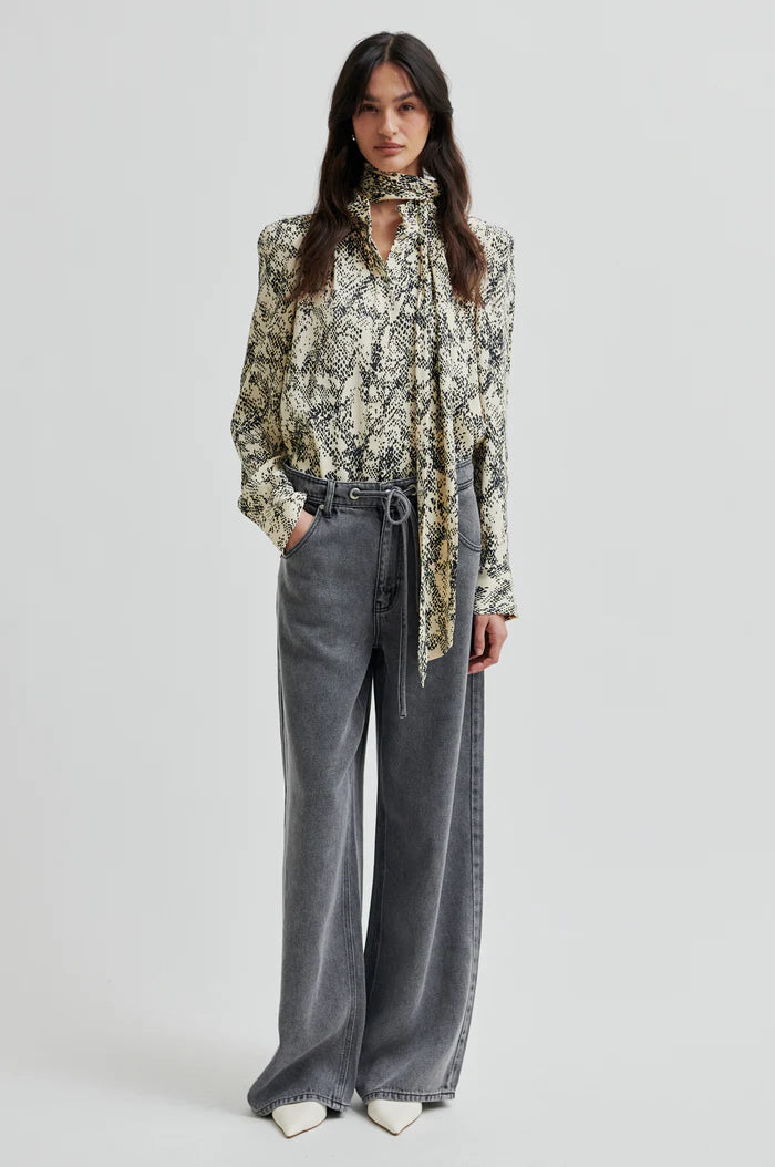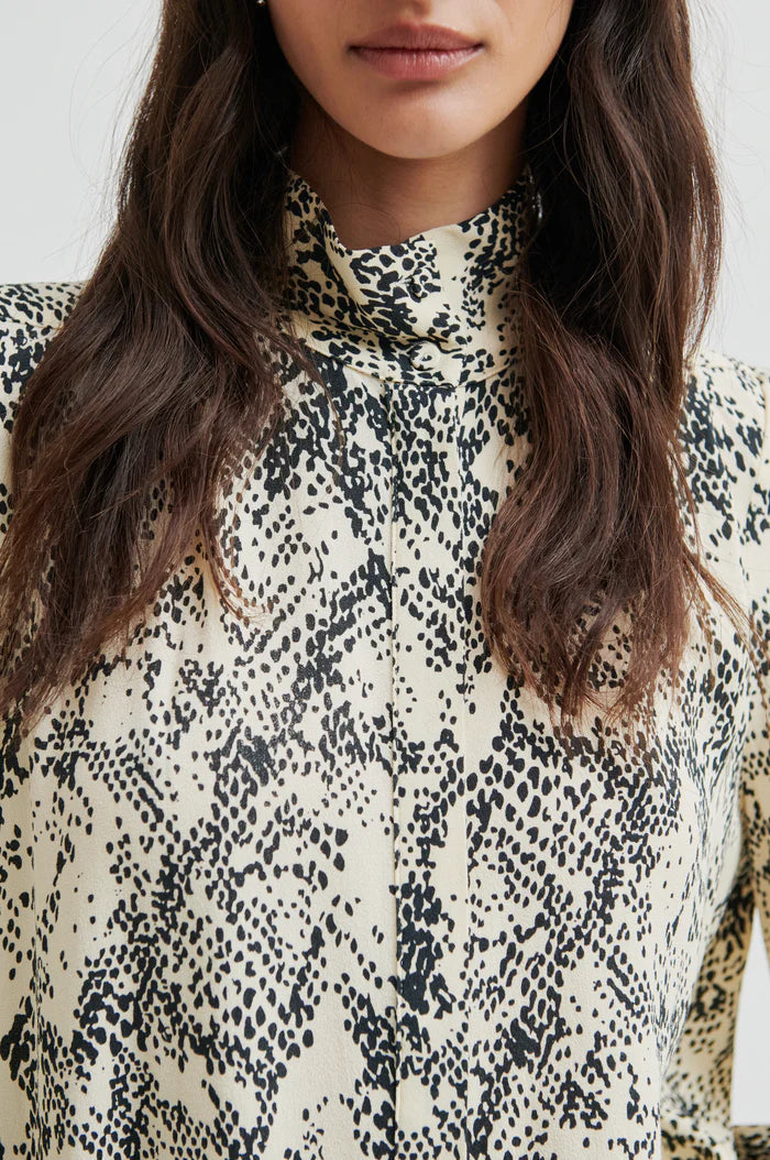 Second Female printed shirt. The shirt is made in lightweight drapy viscose. Featuring a high neck with concealed button fastening at the front. Detachable tie at back of neck. Puffed shoulders and long sleeves with buttoned cuffs. Relaxed fit.
