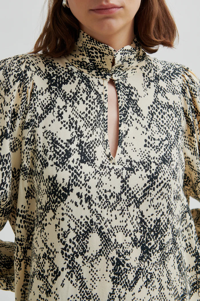 Second Female printed dress. The dress is made in lightweight drapy viscose. Featuring a keyhole opening with button fastening at the front. Detachable tie at back of neck. Long sleeves with buttoned cuffs. Relaxed, straight fit.
