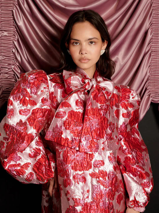 The Dolly Mini is oversized charm in floral jacquard. Finished with a bow that steals the show. Whimsy with a showgirl wink you will be ready to enter the stage this festive season.