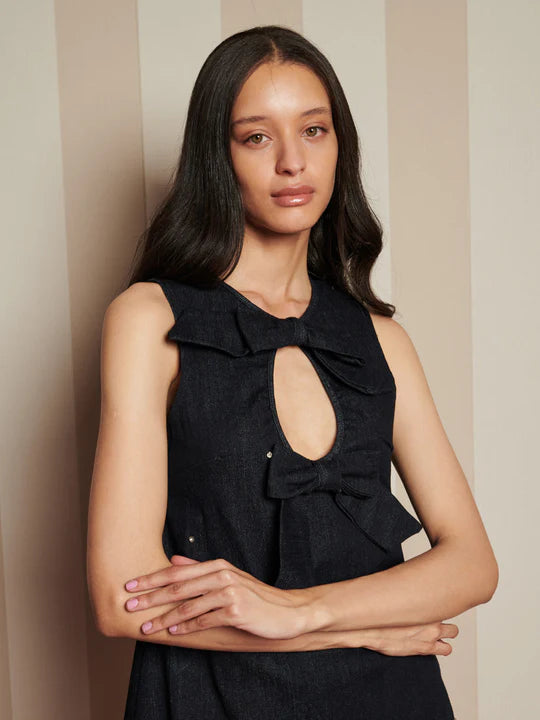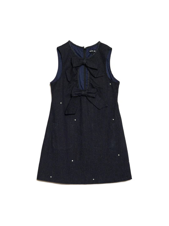 Mini length dress in a structured denim fabric with all over gem embellishments. Featuring a front cut out with fixed bow in matching fabric. Fastened with a concealed zip.