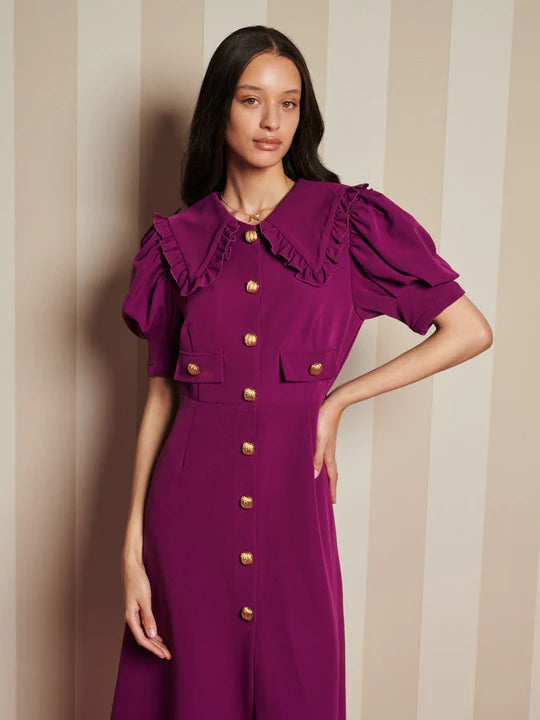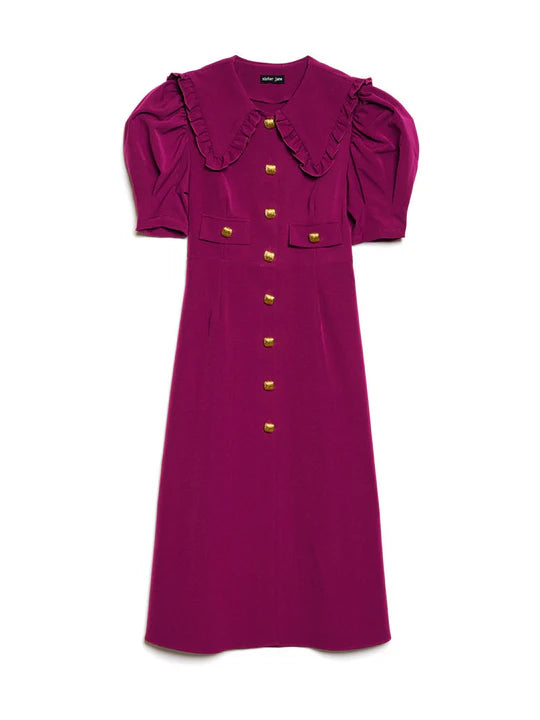 With its statement collar and golden buttons, the Spice Jar Midi Dress brings elegance to the table.