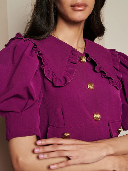 Midi length dress in a woven crepe fabric. Detailed with a statement ruffle collar and gold buttons to fasten. The length of the dress is 120-126 cm depending on the size.