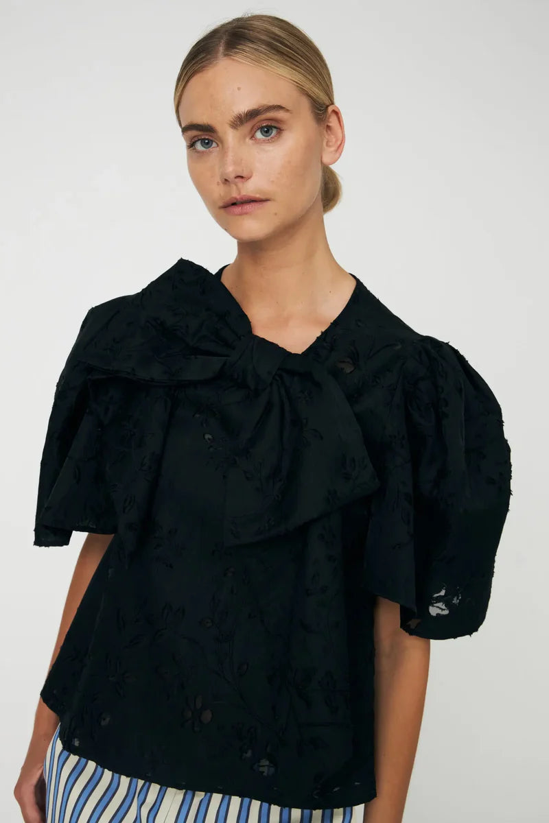 Blouse crafted in a lightweight fabric with embroidered details. Designed with short sleeves and an A-line shape, and with a prominent side bow. Closure with a button and loop in the back.