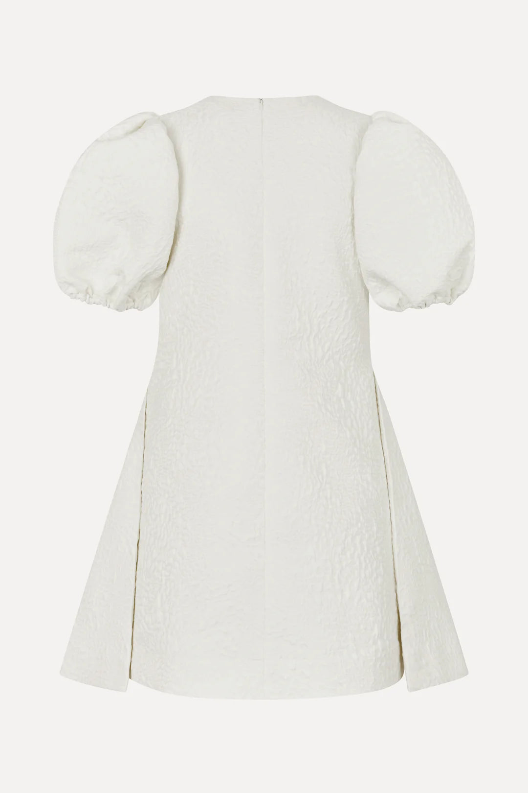 Short dress in off-white textured woven jacquard with subtle floral detailing. Designed with voluminous short puff sleeves, a sharp V-neckline, and a front slit for added movement. Finished with a hidden back zipper and full lining for a smooth silhouette.