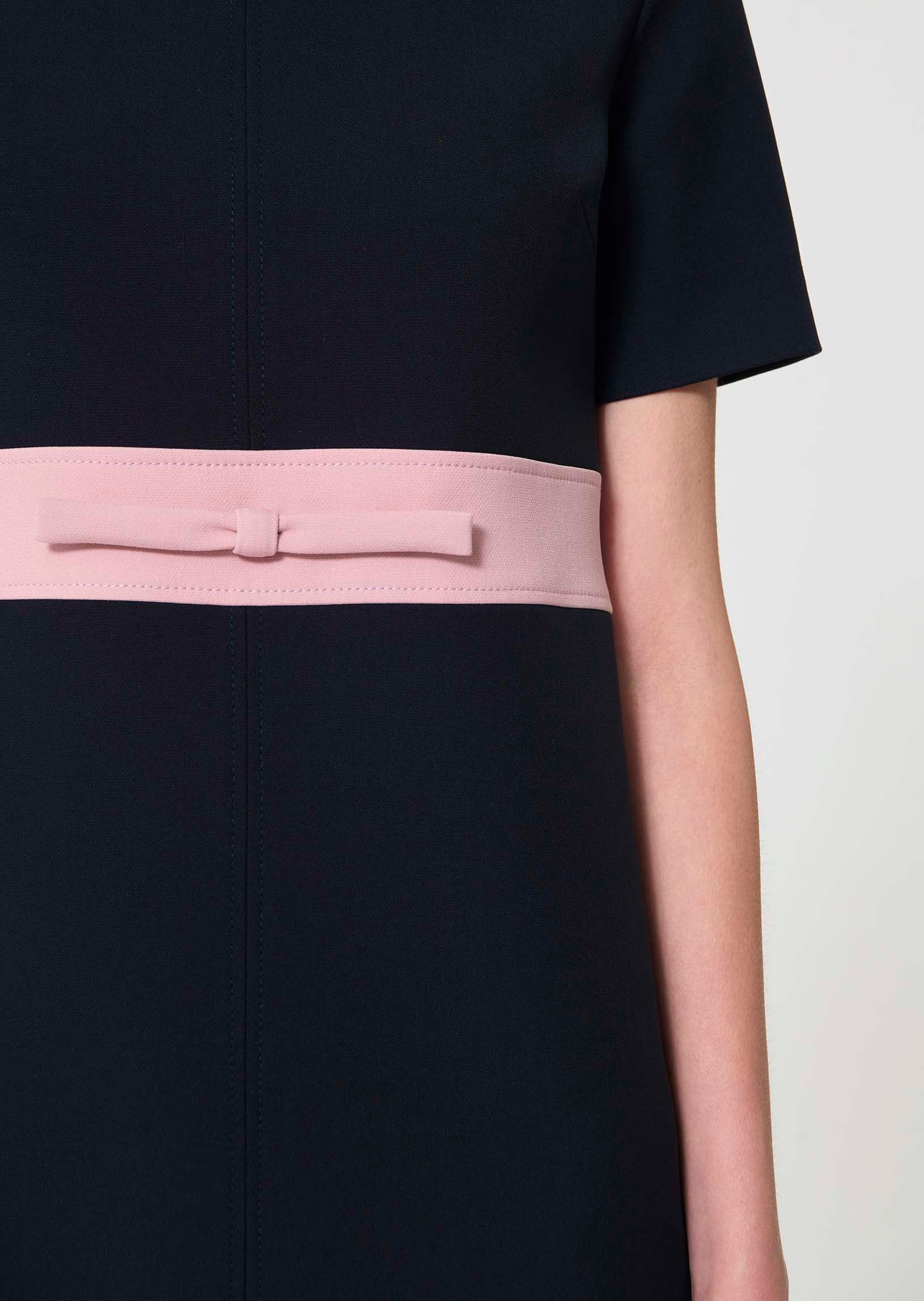 This short, navy blue dress in double-layered canvas features a round neck and short sleeves. Its unique twist lies in the contrasting panel at the waist. The slightly fitted, flared cut and flat bow at the front give it a 60s feel.